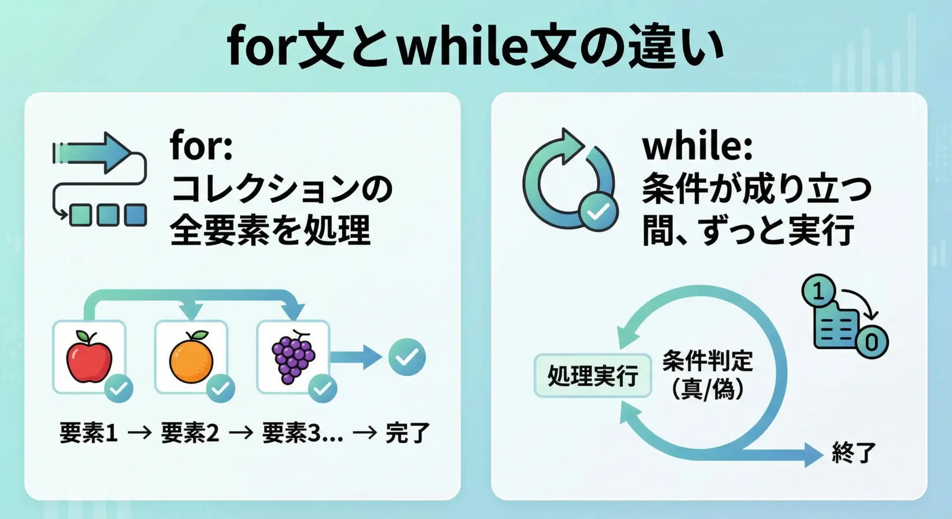 「ある条件が満たされているあいだ、ずっと処理を続けたい」といった条件ベースの繰り返しに向いています。