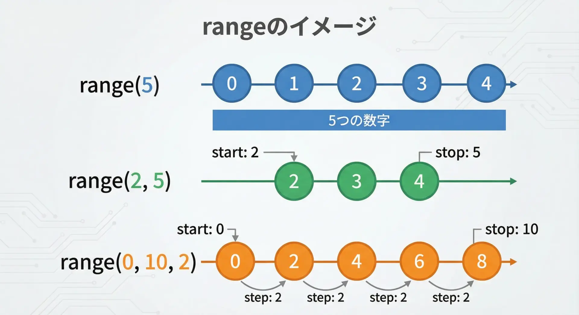 range関数は、一定間隔で並ぶ整数の「連番」を作るための組み込み関数です。
