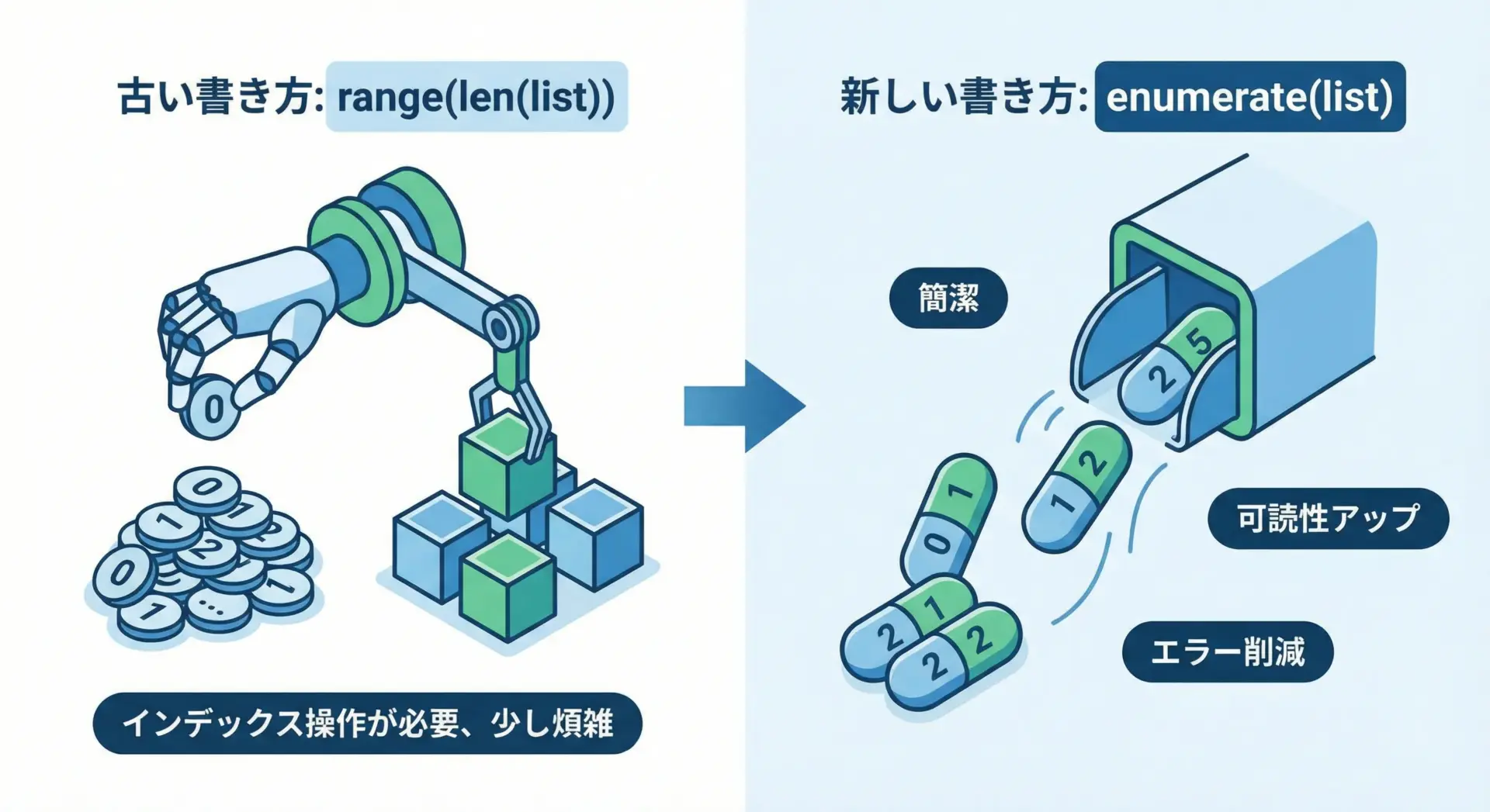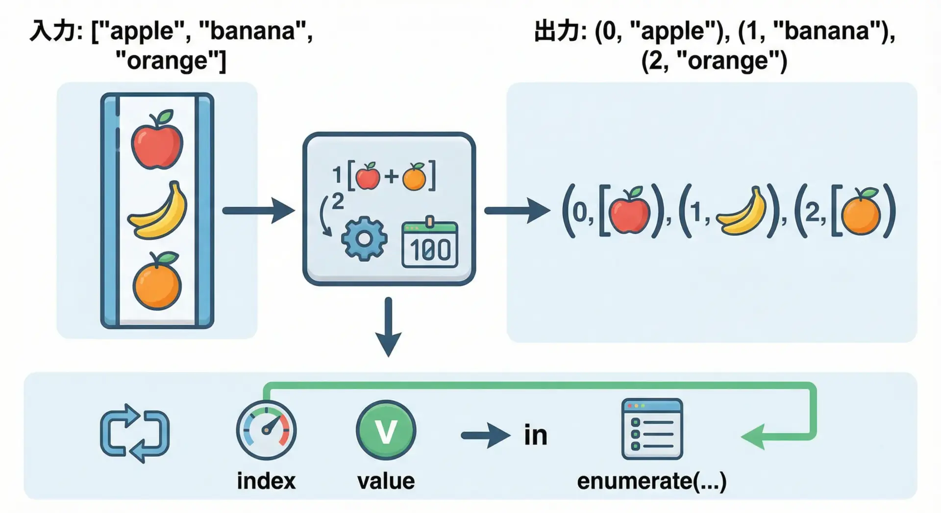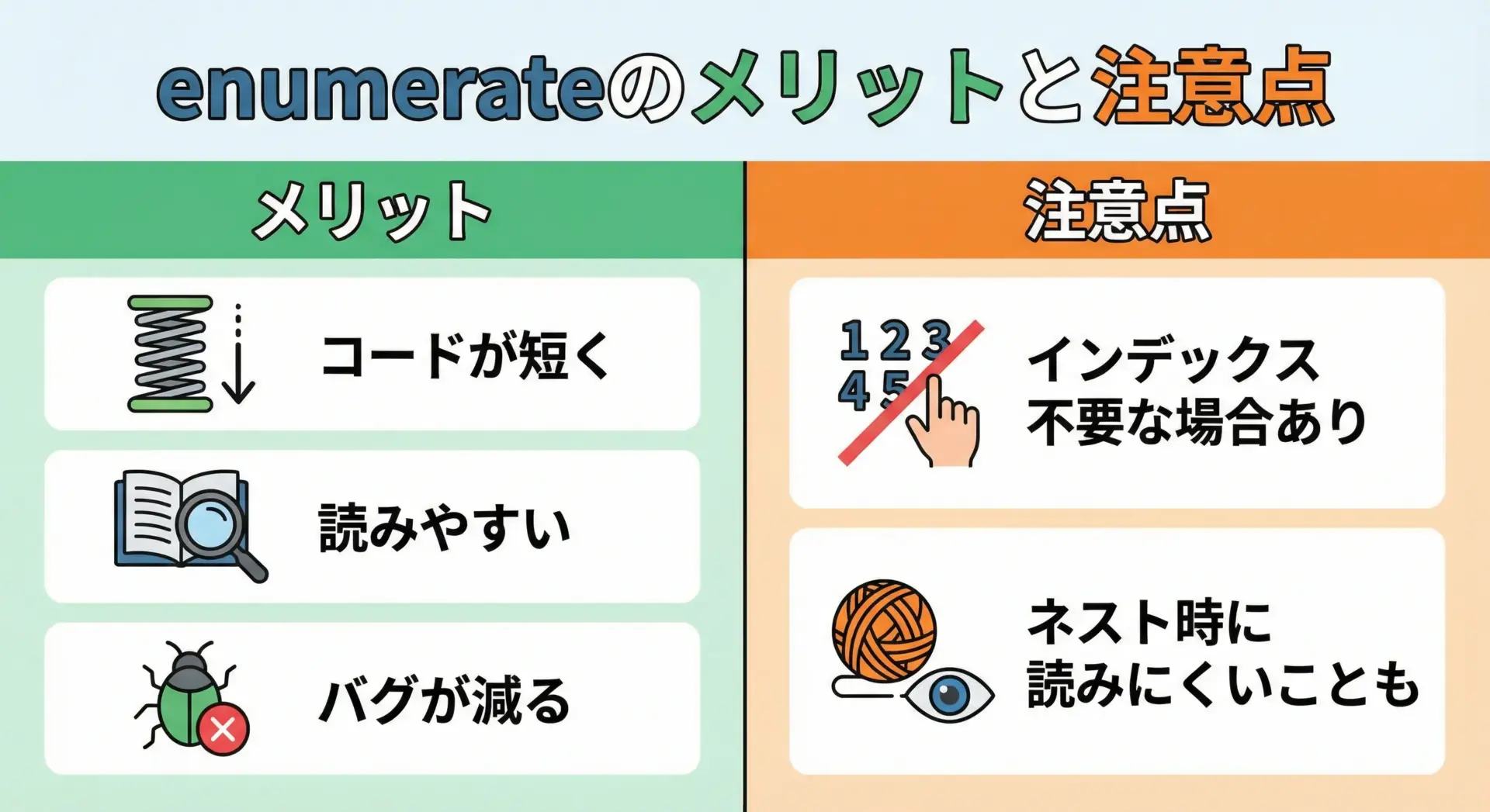 「インデックスが欲しいときにだけenumerateを使う」という意識でいれば、コードは自然と読みやすく整理されていきます。