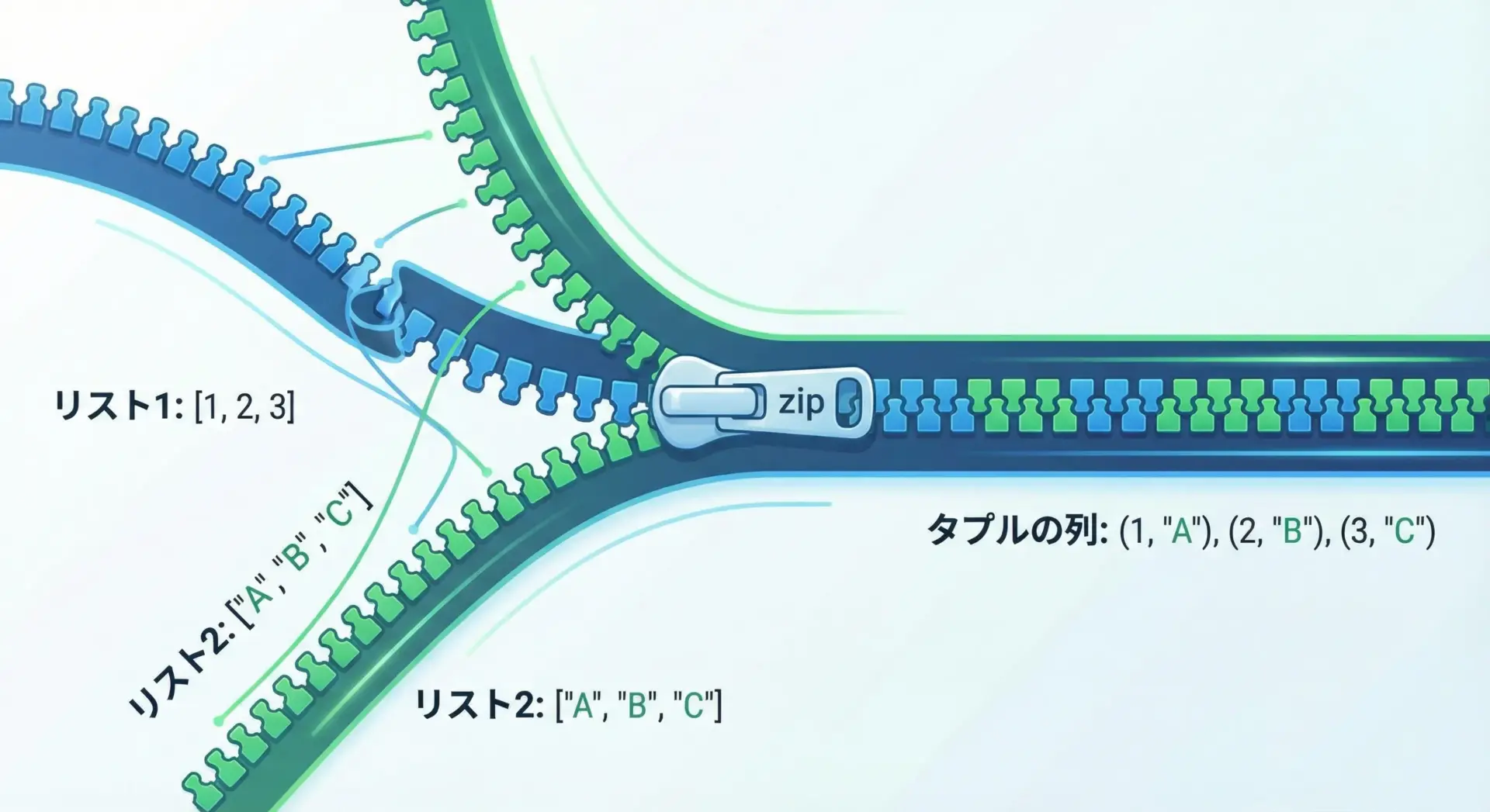 zipは、複数のイテラブル(リストなど)を「同じインデックス同士」でまとめて扱うための組み込み関数です。