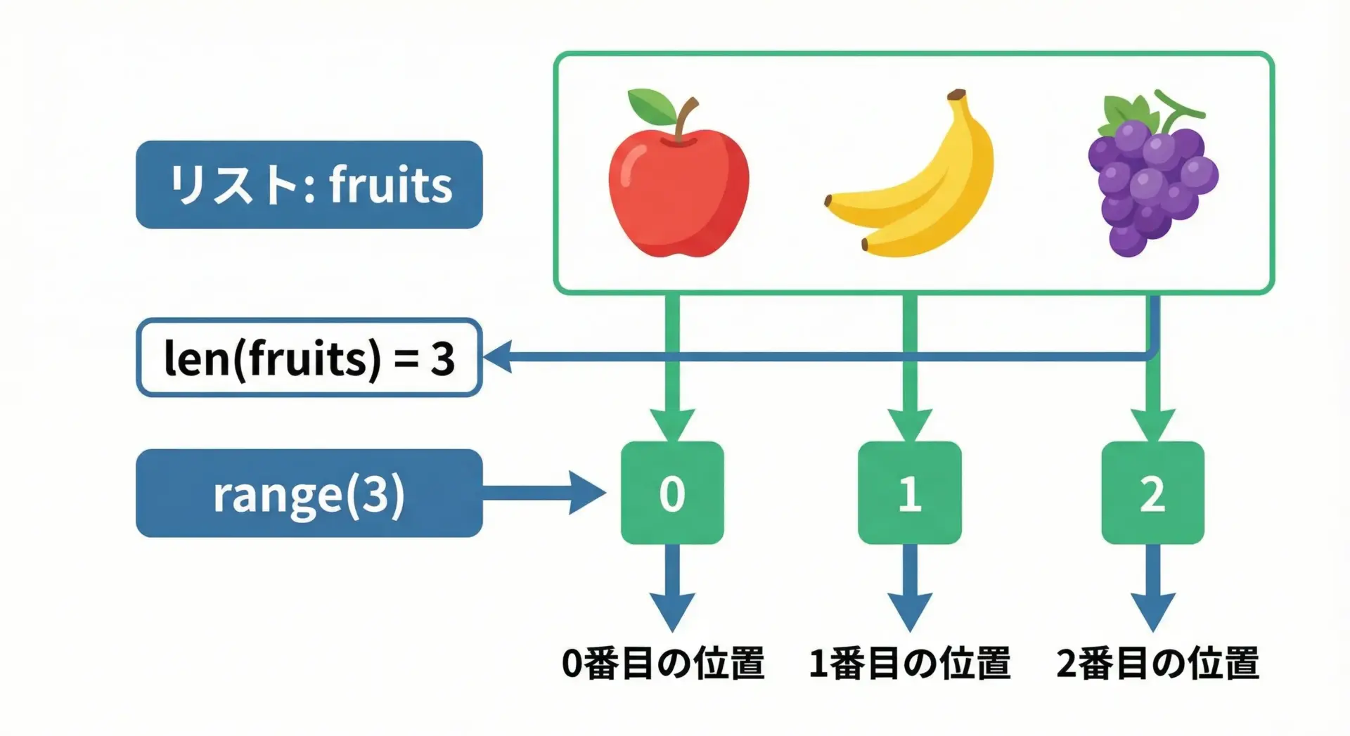 range(len(…))という組み合わせは、インデックスを0から最後の要素まで順番に回すときの定番パターンです。