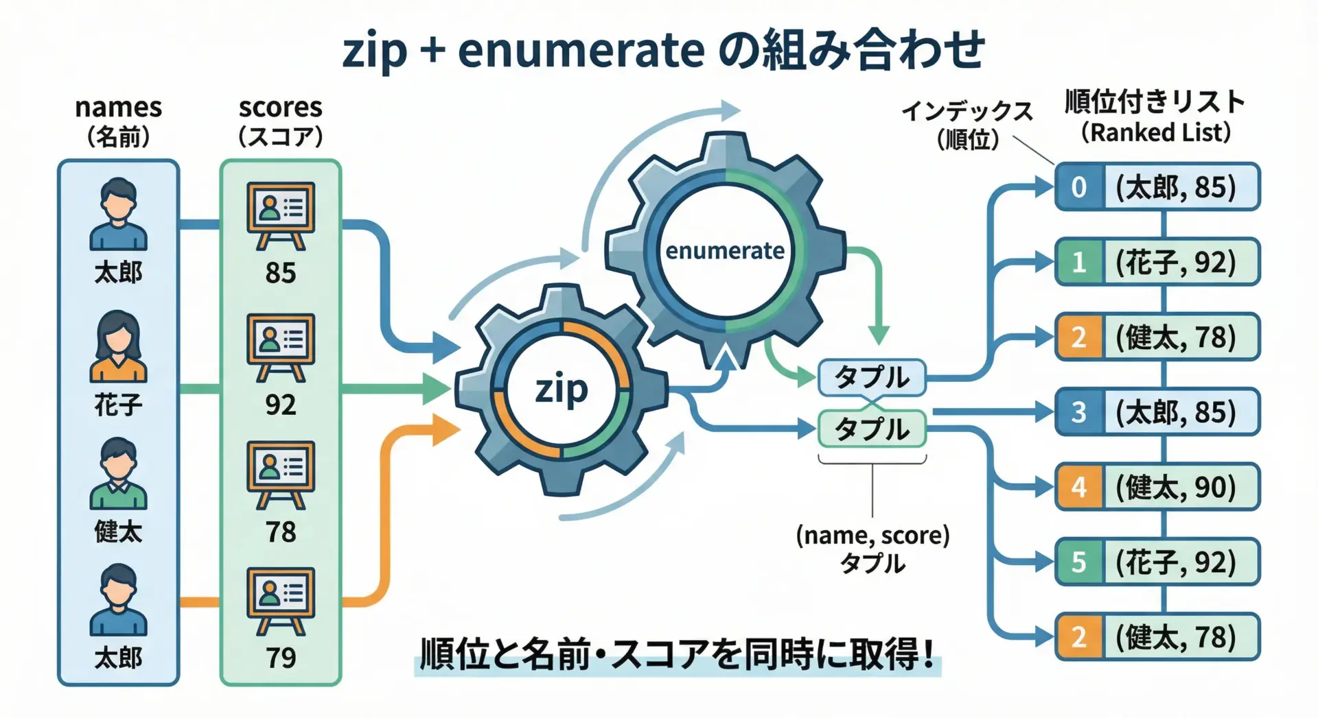 ここでは、enumerate(zip(...), start=1)とすることで、「順位」と「名前+スコア」を同時に扱っていることが分かります。