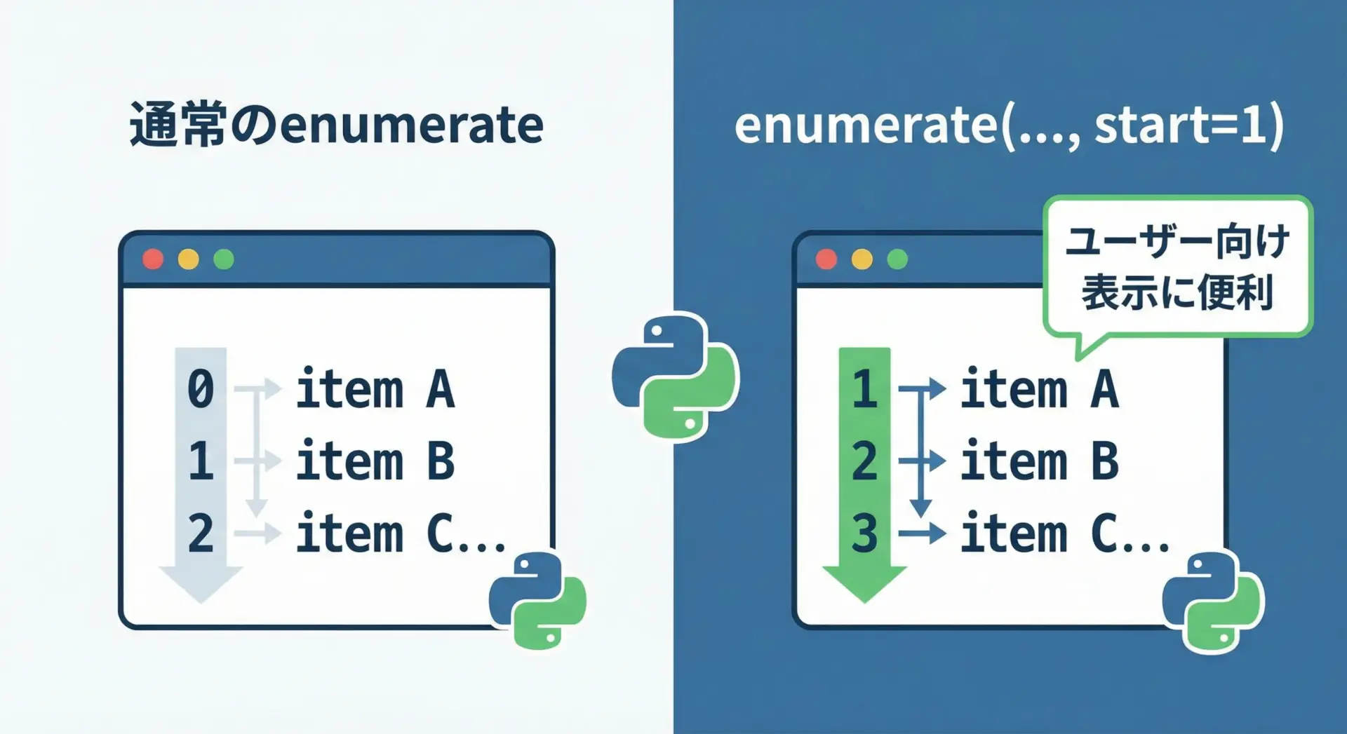 ユーザーに「1番目」「2番目」と表示したい場面で、i + 1と毎回書く代わりに、start=1を使うとコードがすっきりします。