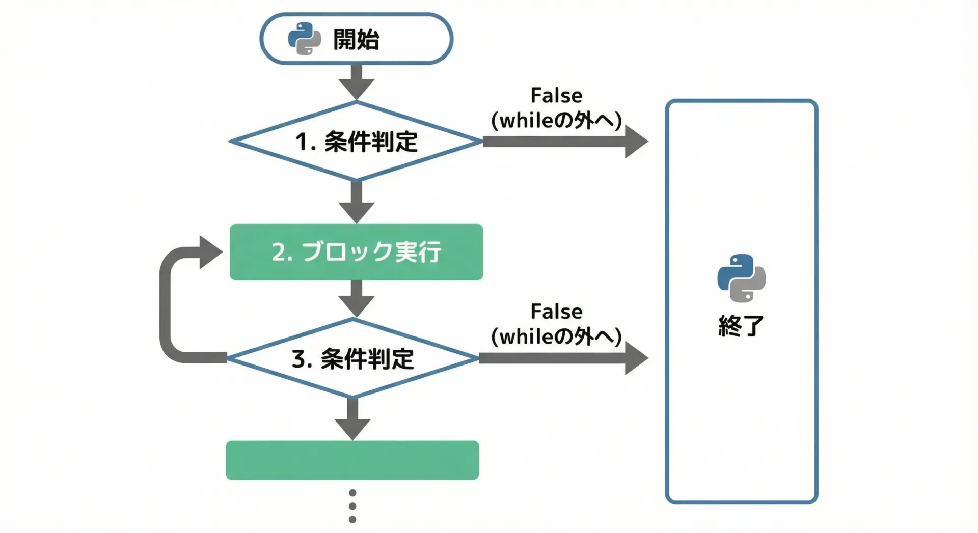 Pythonのwhile文は、条件式がTrueである間、同じブロックの処理を繰り返し実行する構文です。