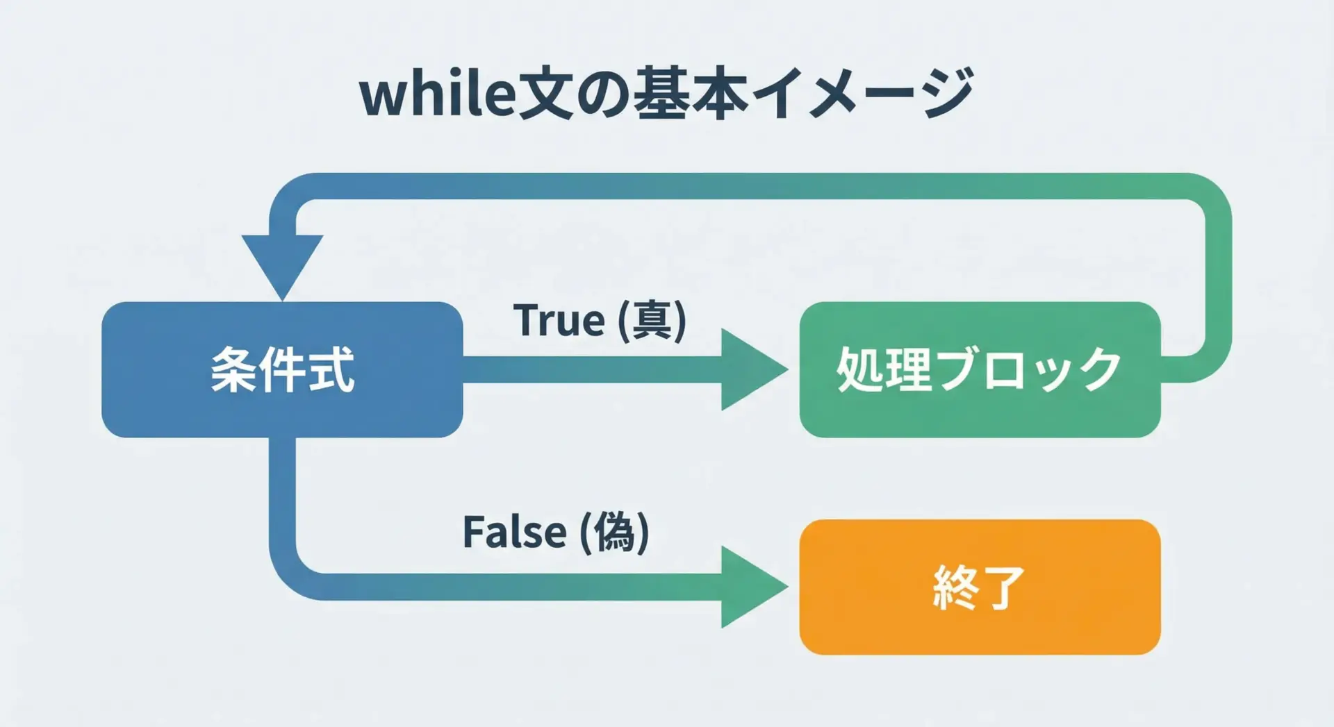 while文は「条件がTrueの間、処理を繰り返す」構文で、特に「いつ終わるか決まっていない処理」に適しています。