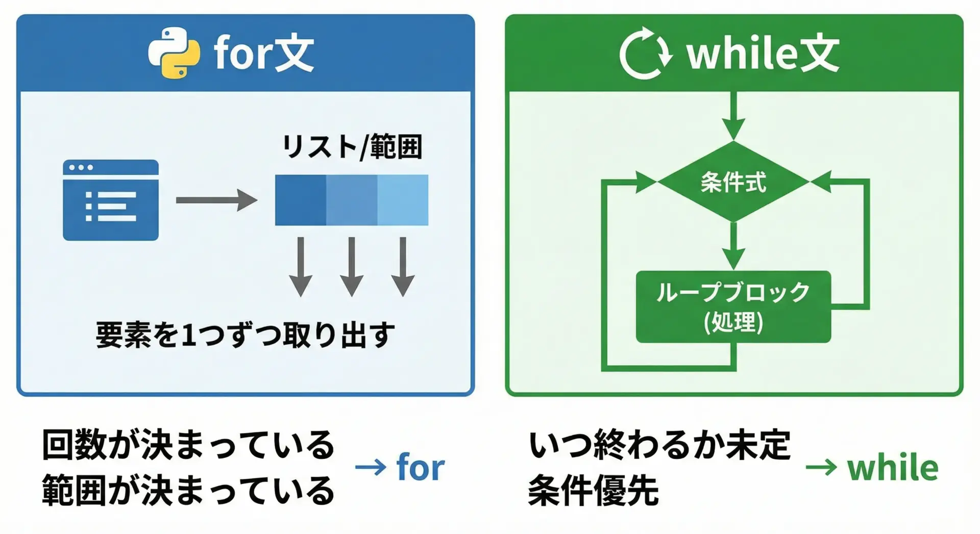 | よくある用途 | リストの全要素処理、決まった回数のループ | ユーザー入力待ち、状態監視、ゲームループなど |