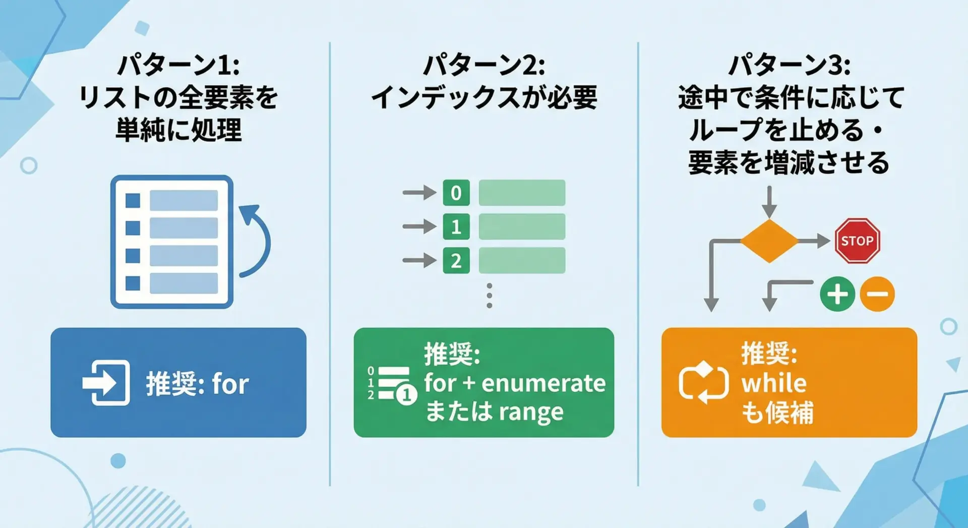 この方針を守ると、コードを見ただけで「これは回数ベースのループなのか、条件ベースのループなのか」が一目で分かるようになります。
