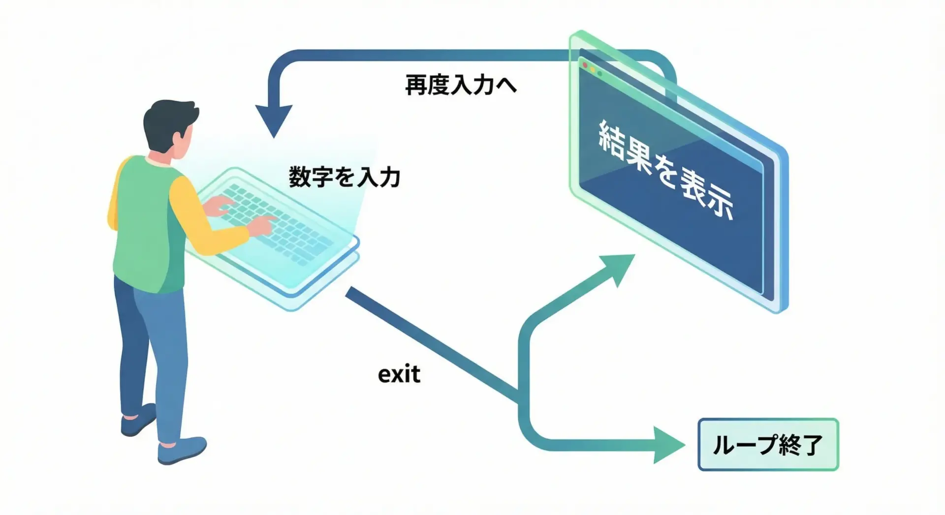 - ユーザーが「exit」「終了」などの特定の文字列を入力するまで、入力受付と処理を繰り返す