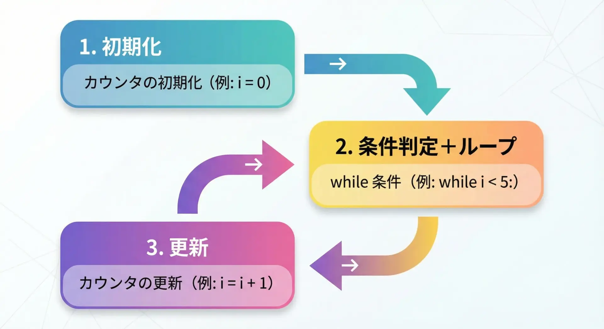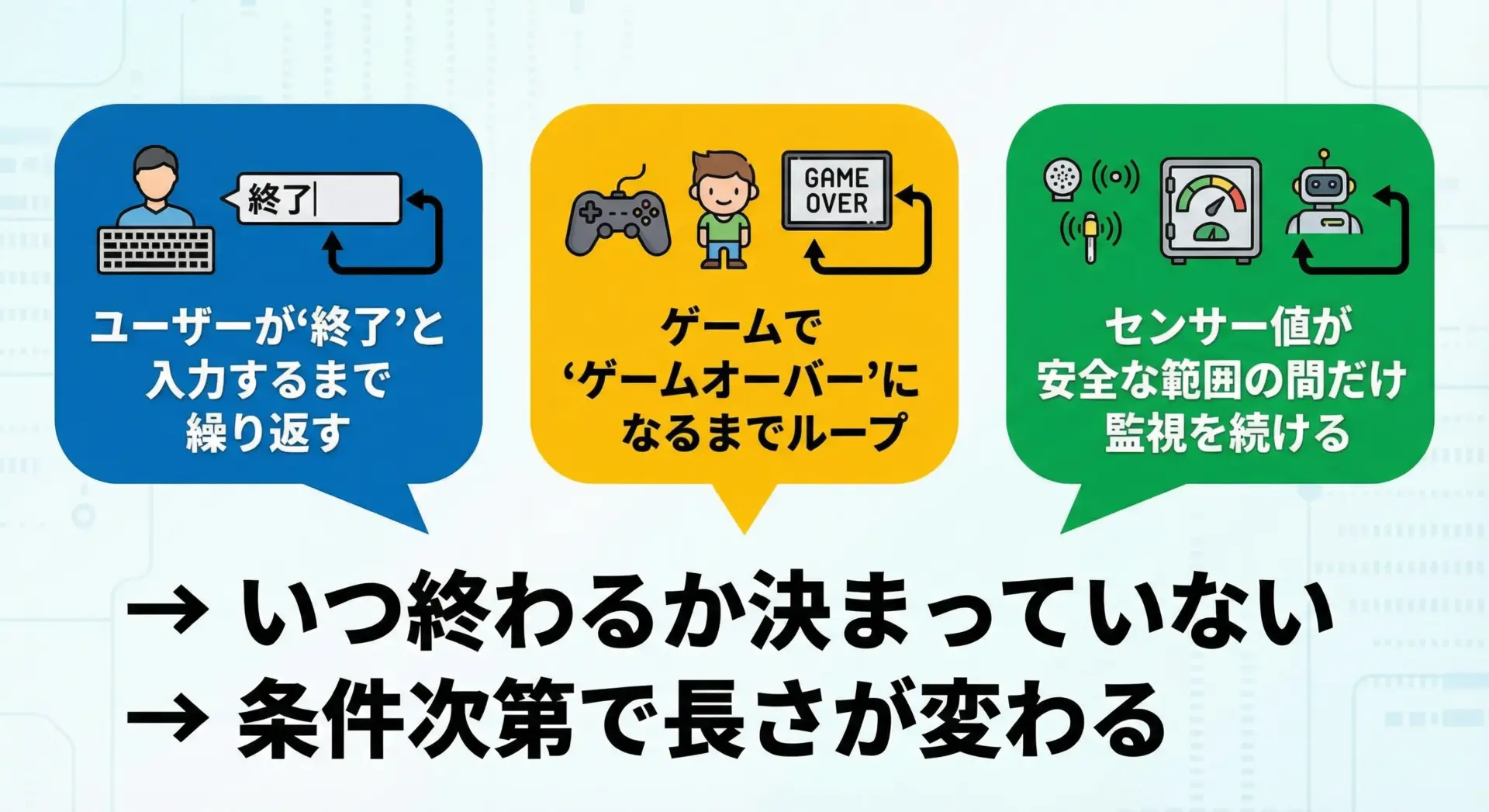 for文と比べて「いつ終わるか決まっていない処理」に強く、ユーザー入力待ちやゲームループなどで活躍します。