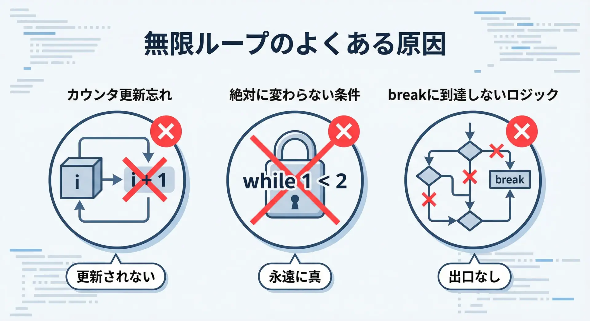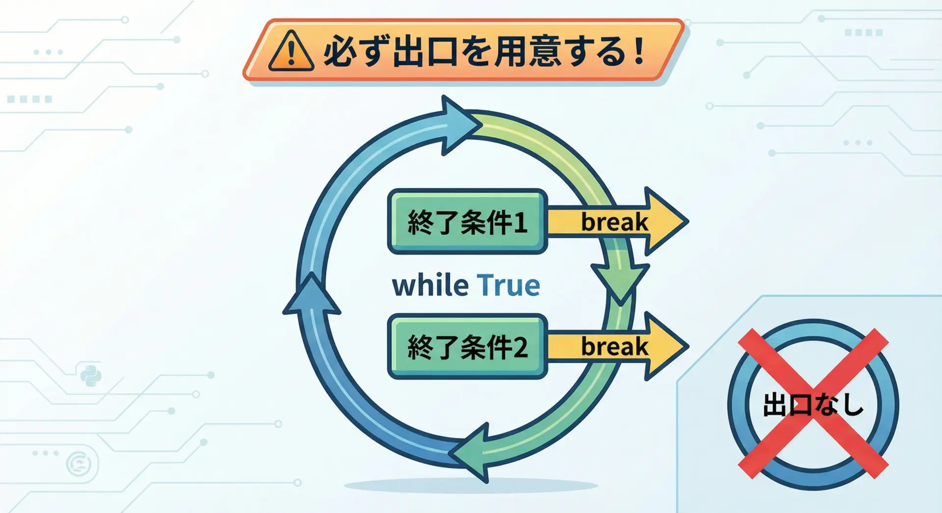 無限ループを防ぐためには、条件式とカウンタ更新の整合性を常に意識し、必要に応じてbreakやwhile True+安全装置を活用してください。