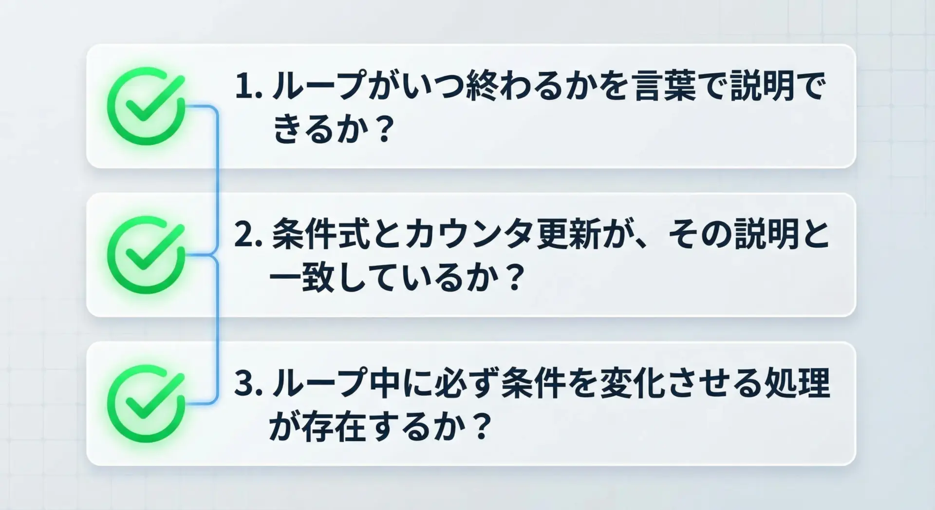 このように日本語の仕様 → 条件式 → 更新処理が一貫しているかどうかを確認すると、無限ループをかなり防げます。