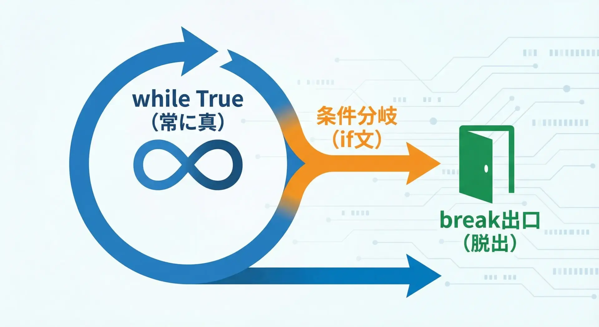 while True:は一見すると無限ループで危険に見えますが、適切にbreakと組み合わせれば、非常に読みやすく書ける構文です。