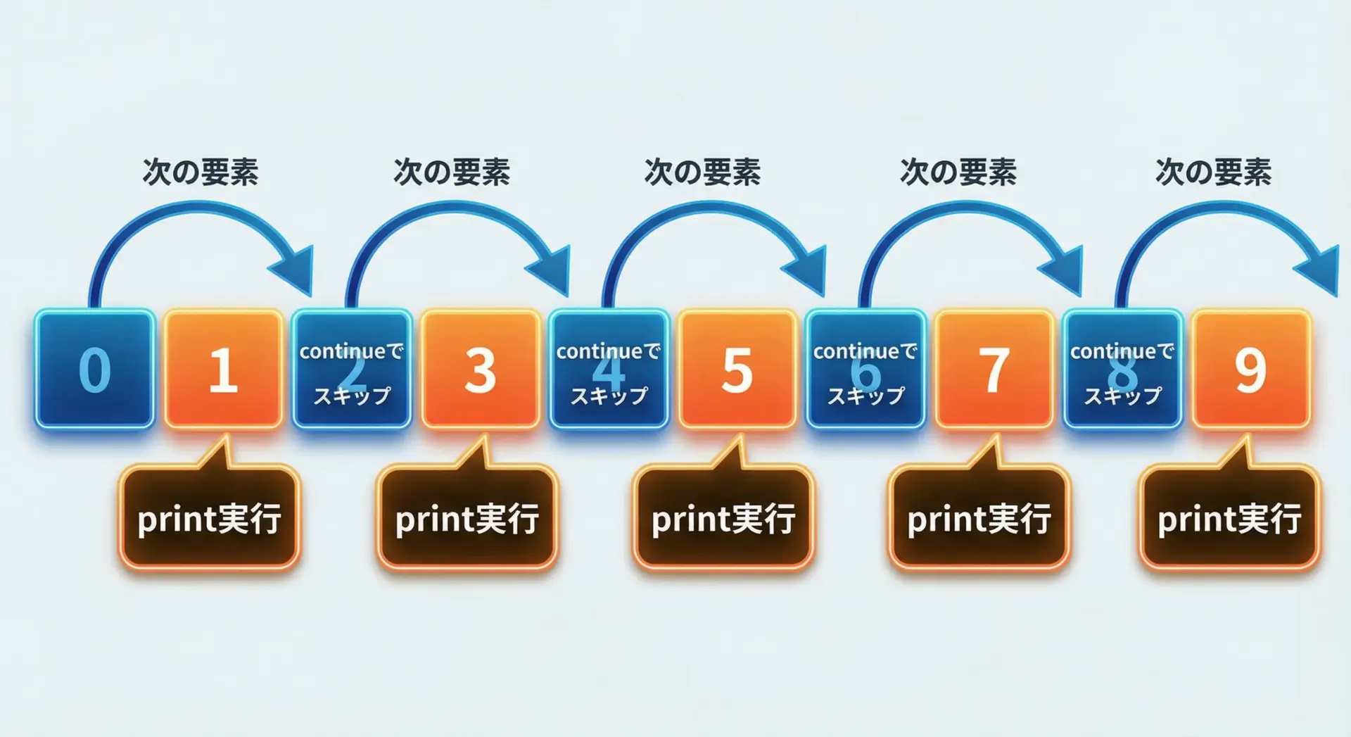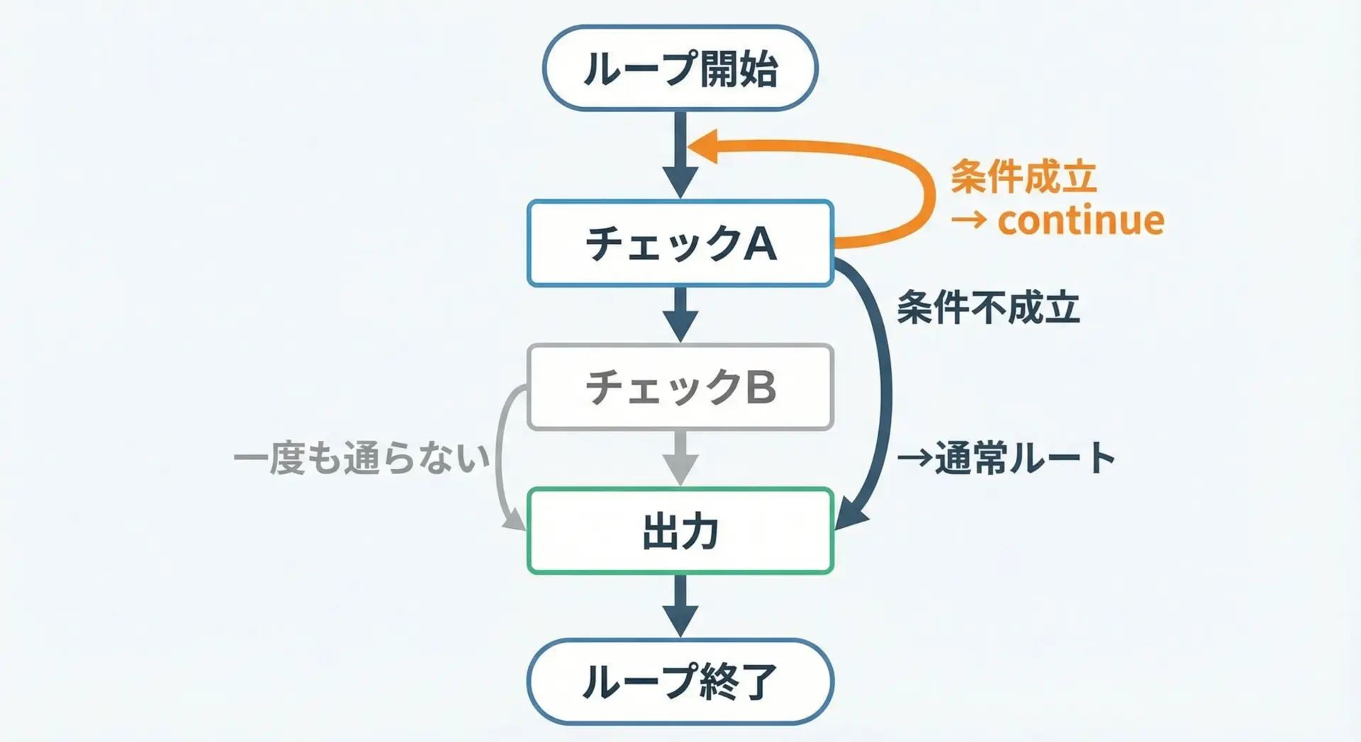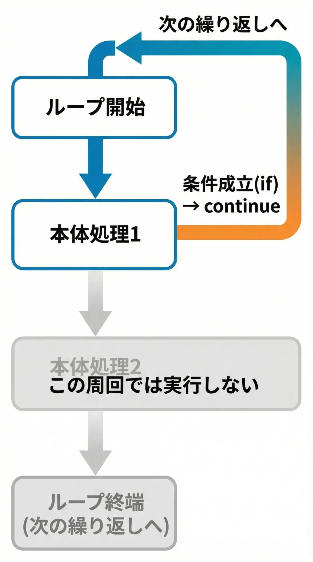 ループ全体を終わらせるのではなく、「この回はもうこれ以上処理しなくていい」と判断したときに、その周回の残りの処理を飛ばして、ループの先頭に戻ります。