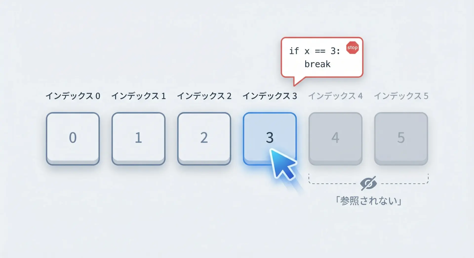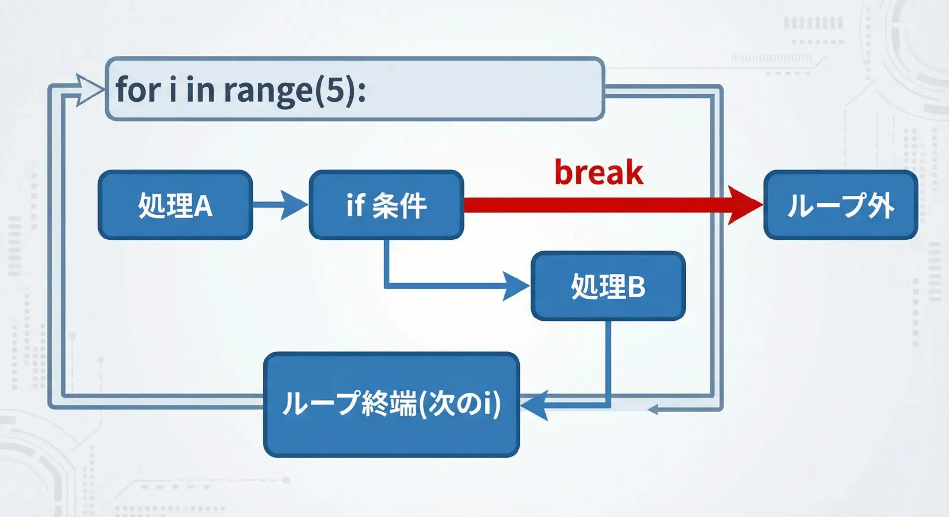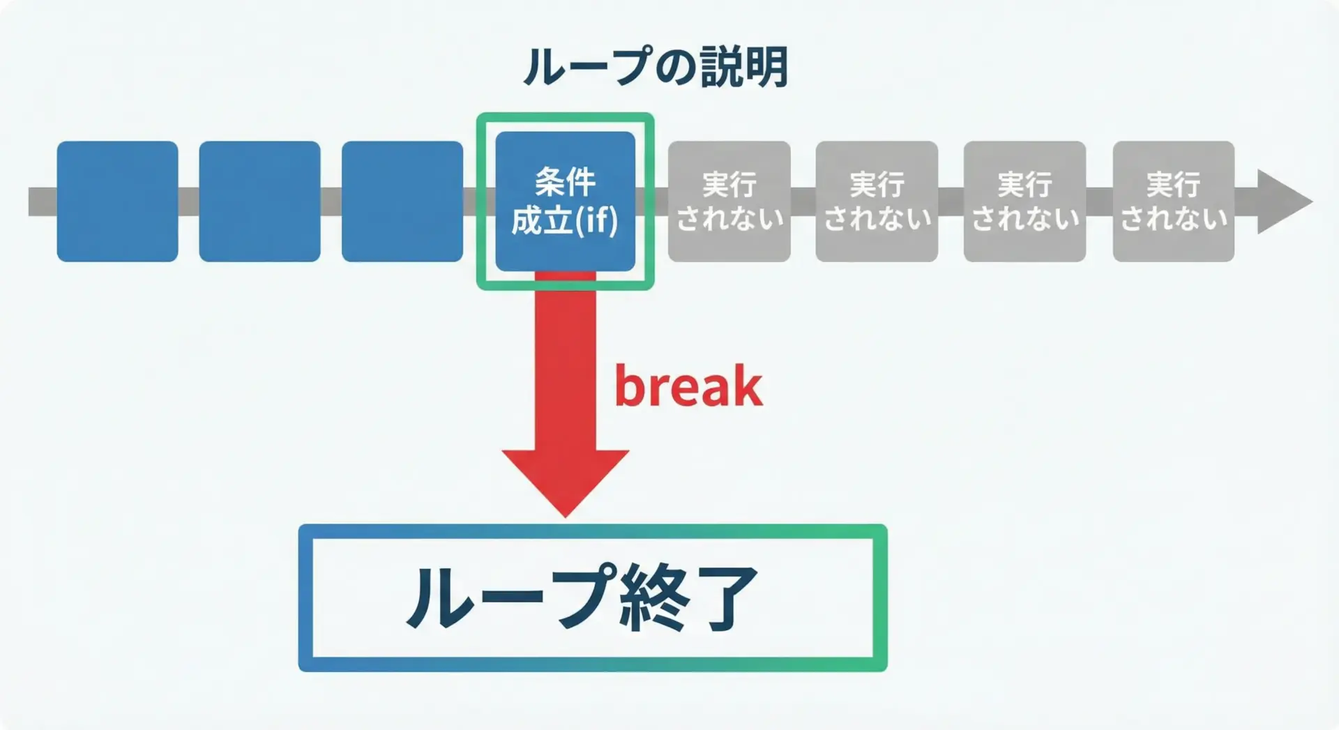 ループの途中で「もうこれ以上繰り返す必要がない」と判断したときに、残りの処理をスキップして、一気にループの外側へ処理を移動させます。