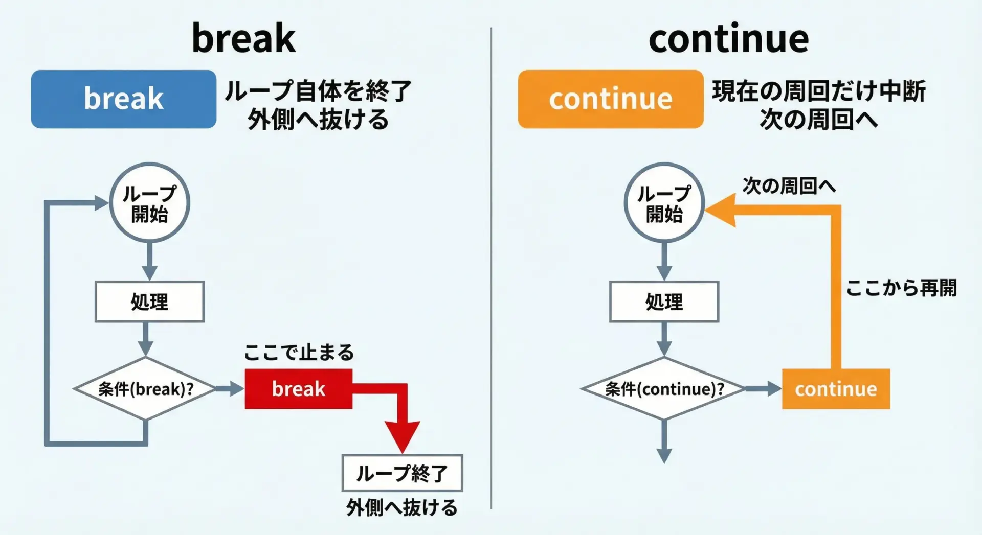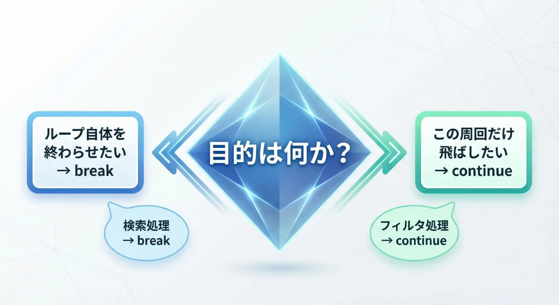検索処理など「条件を満たしたら即終了したい場面」ではbreak、フィルタ処理など「特定条件のときだけスキップしたい場面」ではcontinueが力を発揮します。
