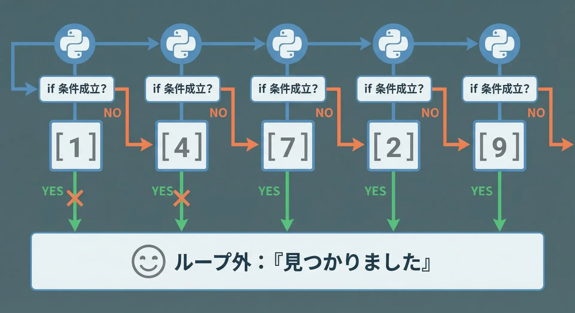 検索処理などでは、if文とbreakを組み合わせて「条件を満たしたら即終了」という書き方をよくします。