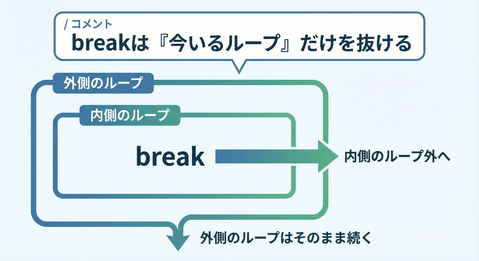 この「途中で飛び出す」という感覚を持っておくと、ネストしたループ(入れ子のループ)でも理解しやすくなります。