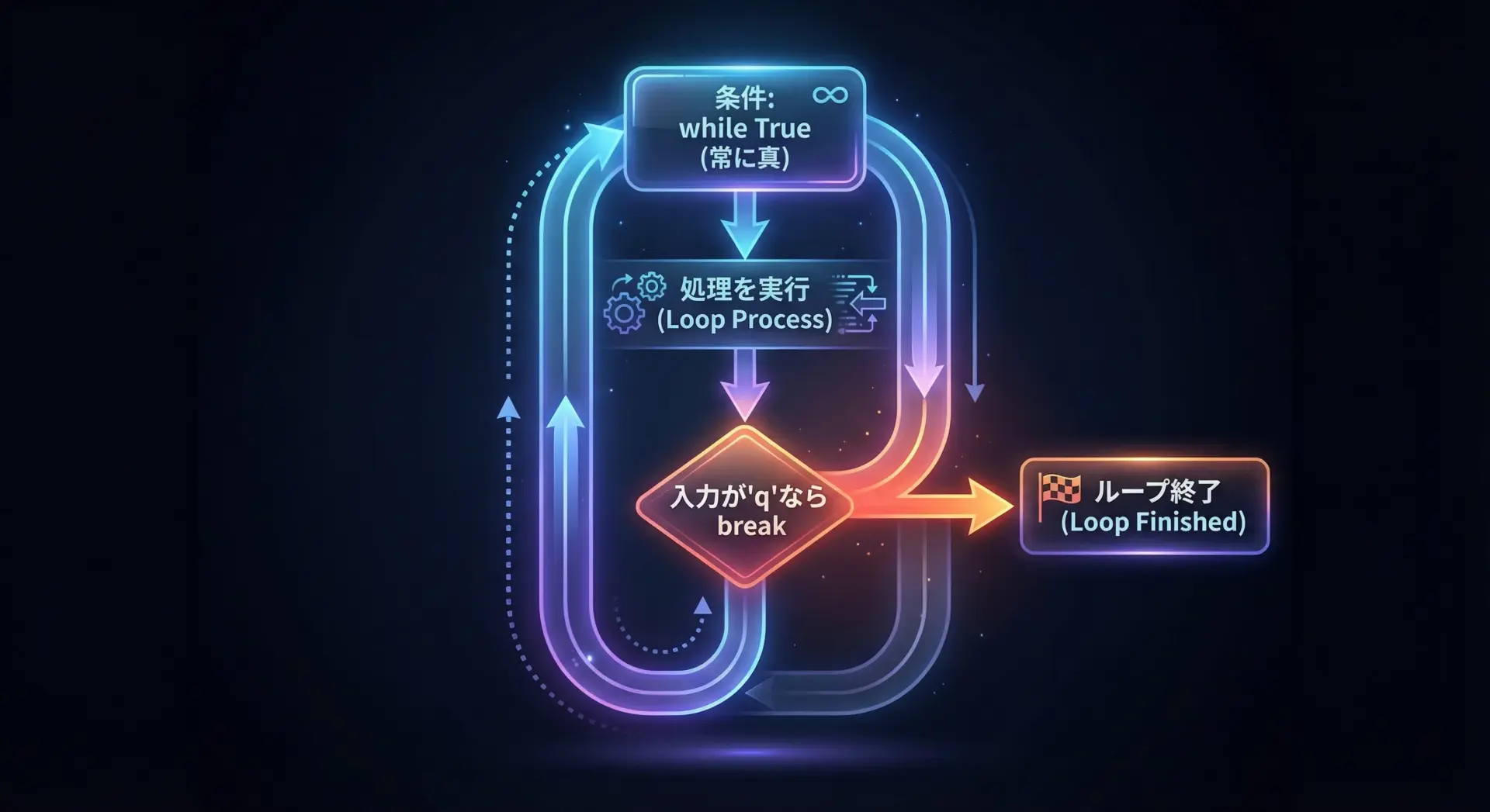 上のコードでは、条件はTrueなので本来なら終わりませんが、“q”が入力されたときだけbreakでループから脱出しています。