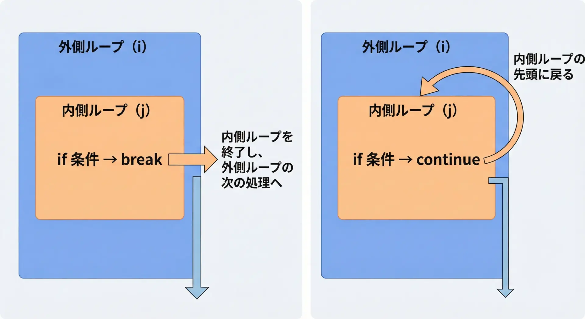 上の例では、breakはあくまで「内側のfor j」のみを終了させています。
