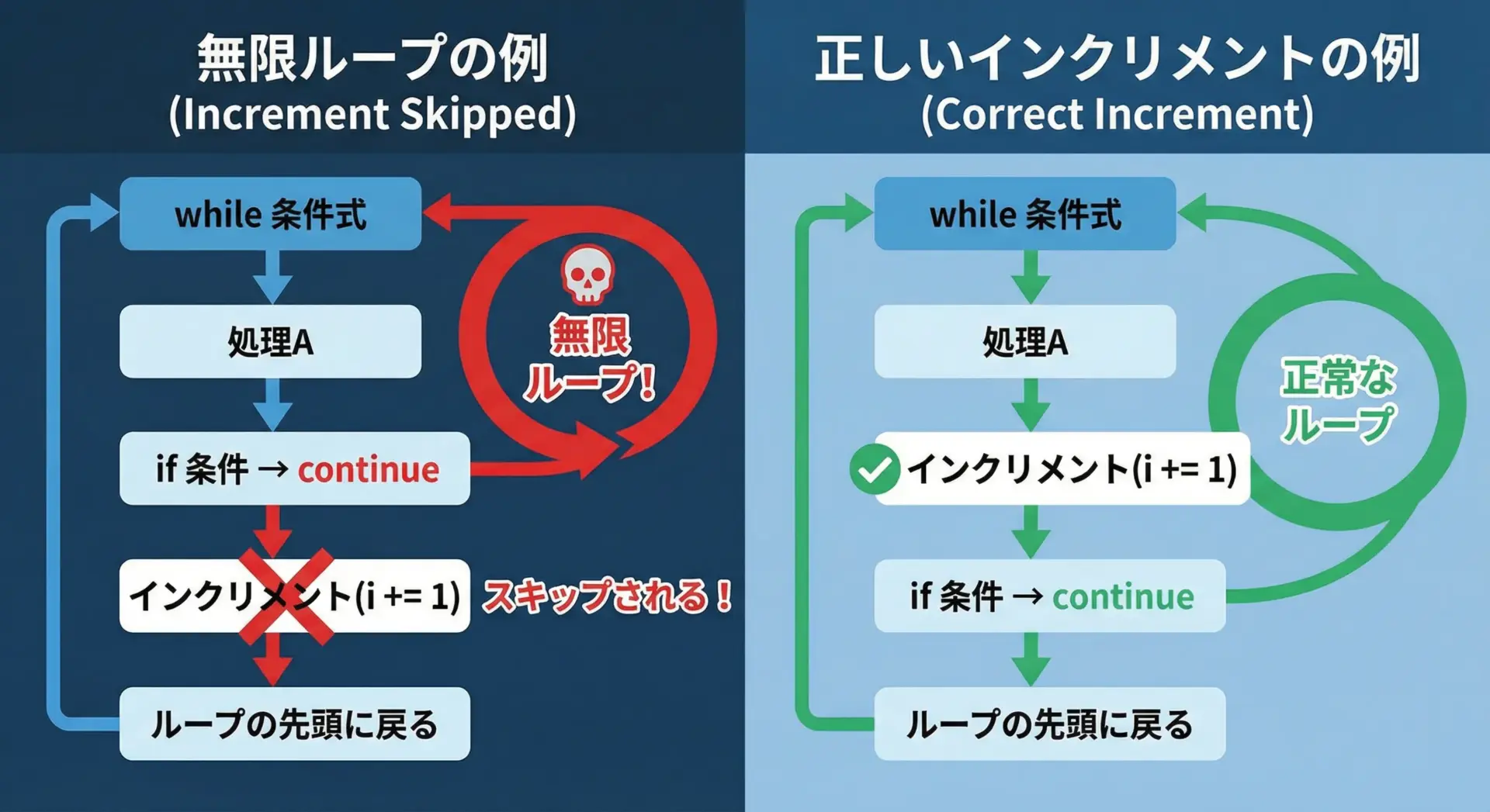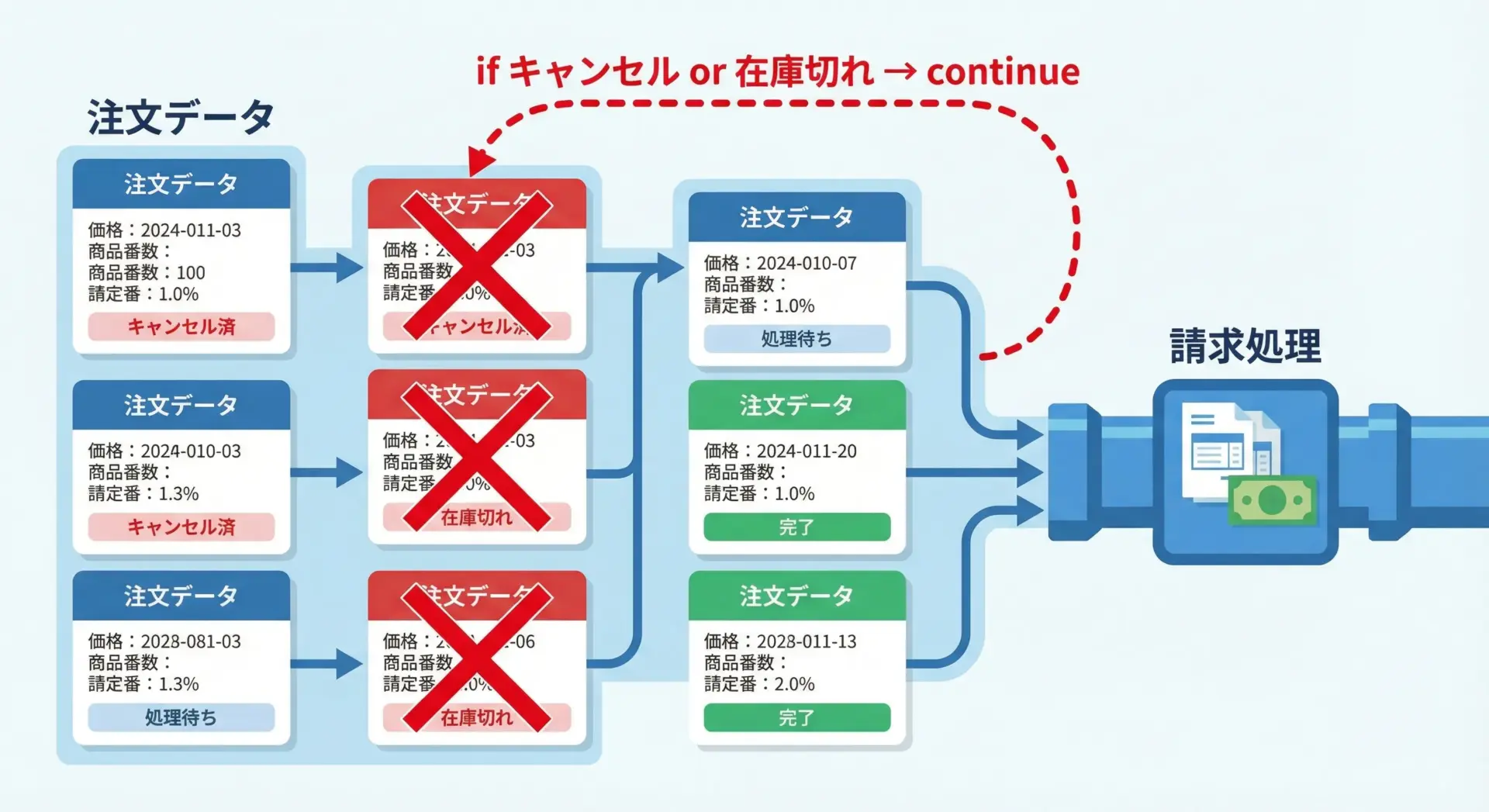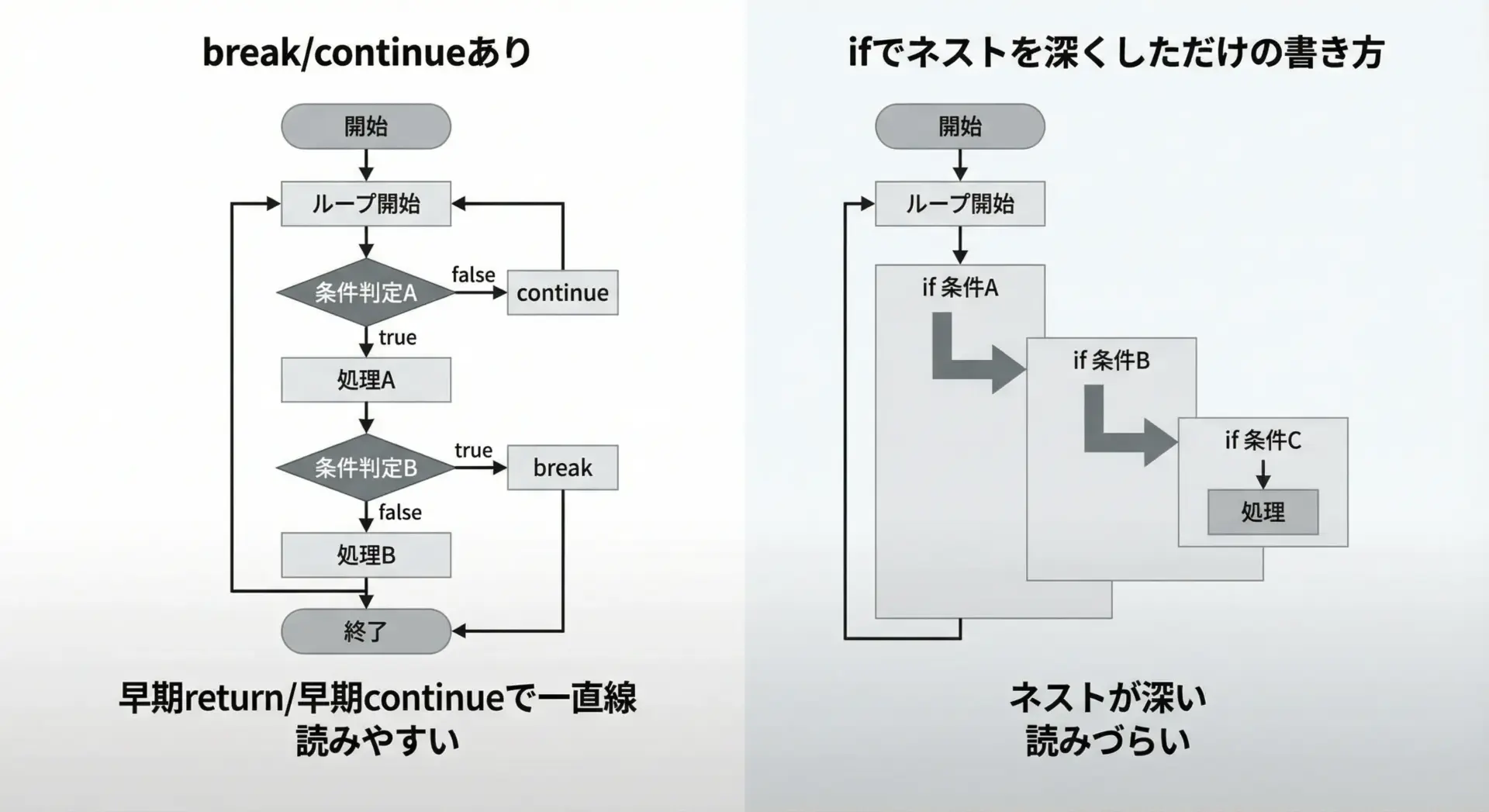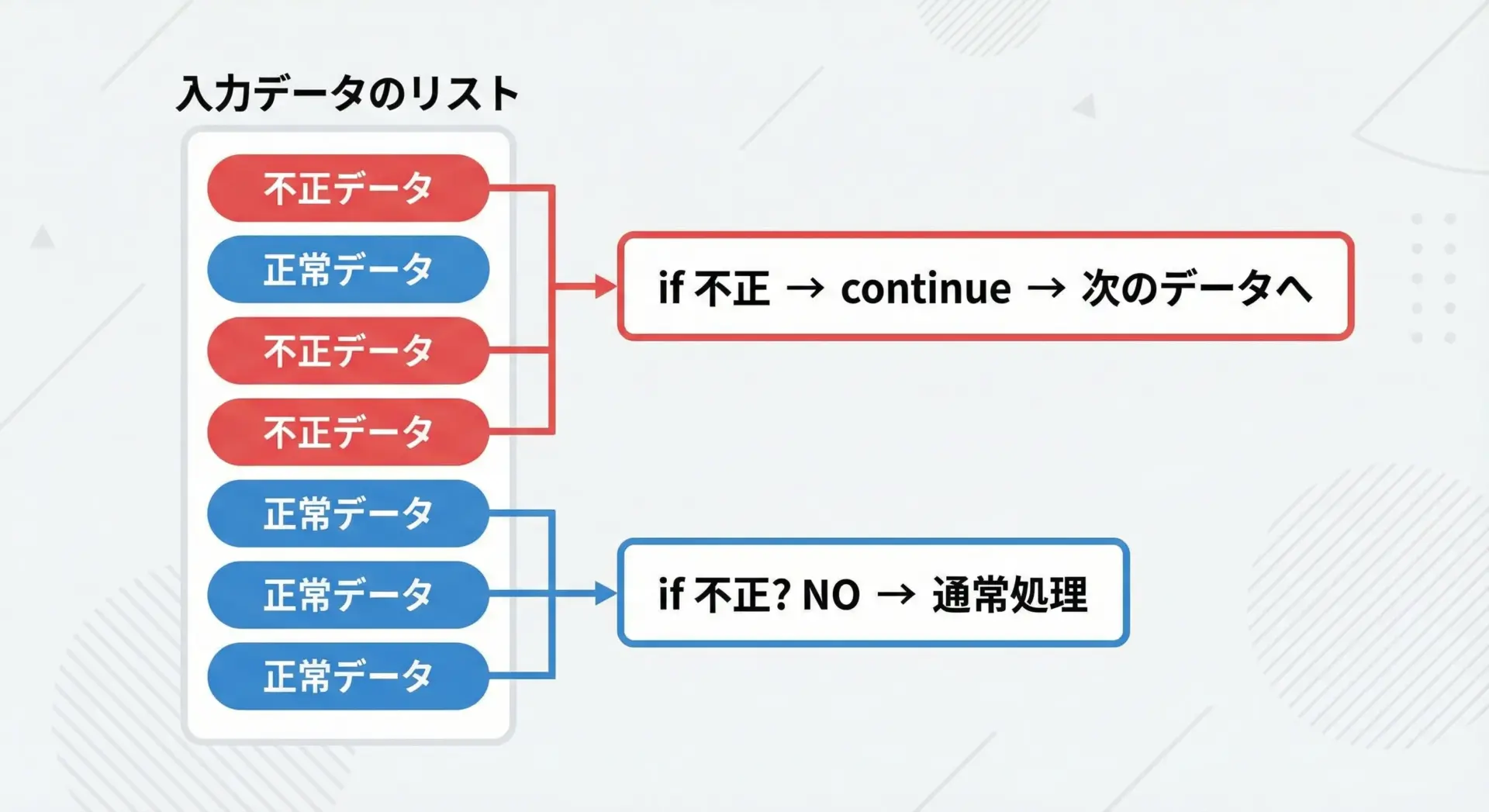ただし、複数の条件でスキップしたいケースでは、「スキップ条件を先に並べてcontinueで弾く」スタイルの方が、処理の意図を理解しやすいことが多いです。
