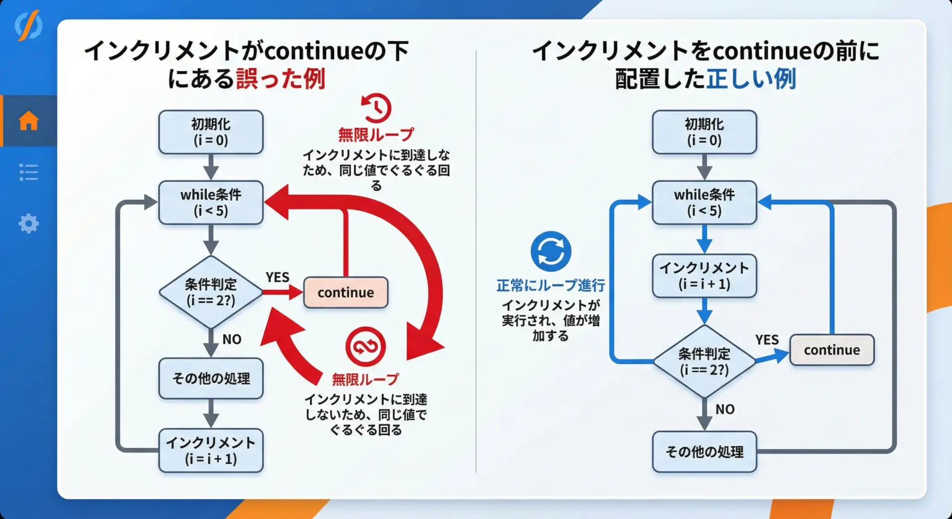 本記事では、図解とサンプルコードを使って、初心者の方でも直感的に理解できるように、breakとcontinueの違いと使い分けを丁寧に解説します。