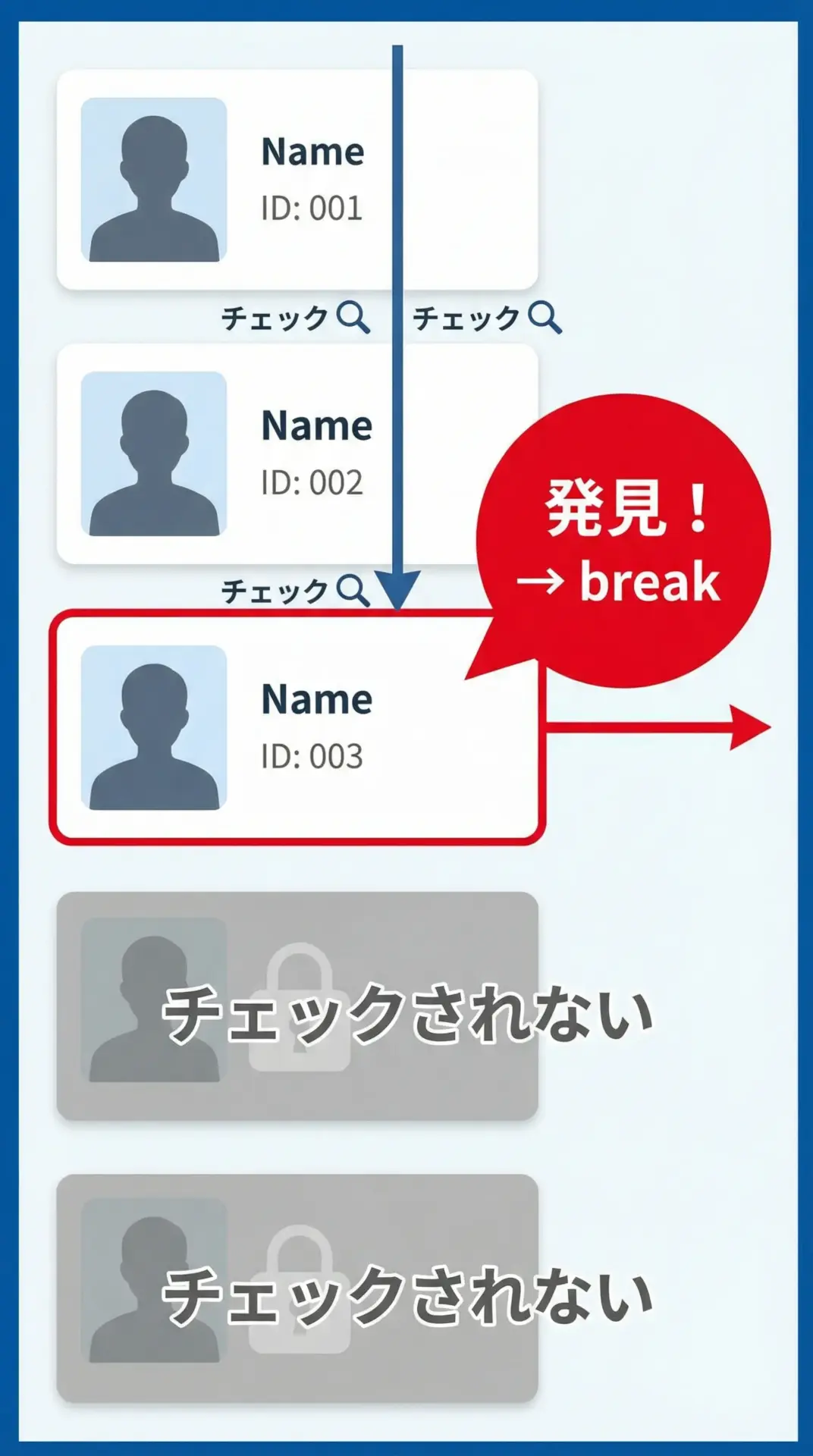 見つかった瞬間にbreakすることで、無駄な探索を省ける点がポイントです。