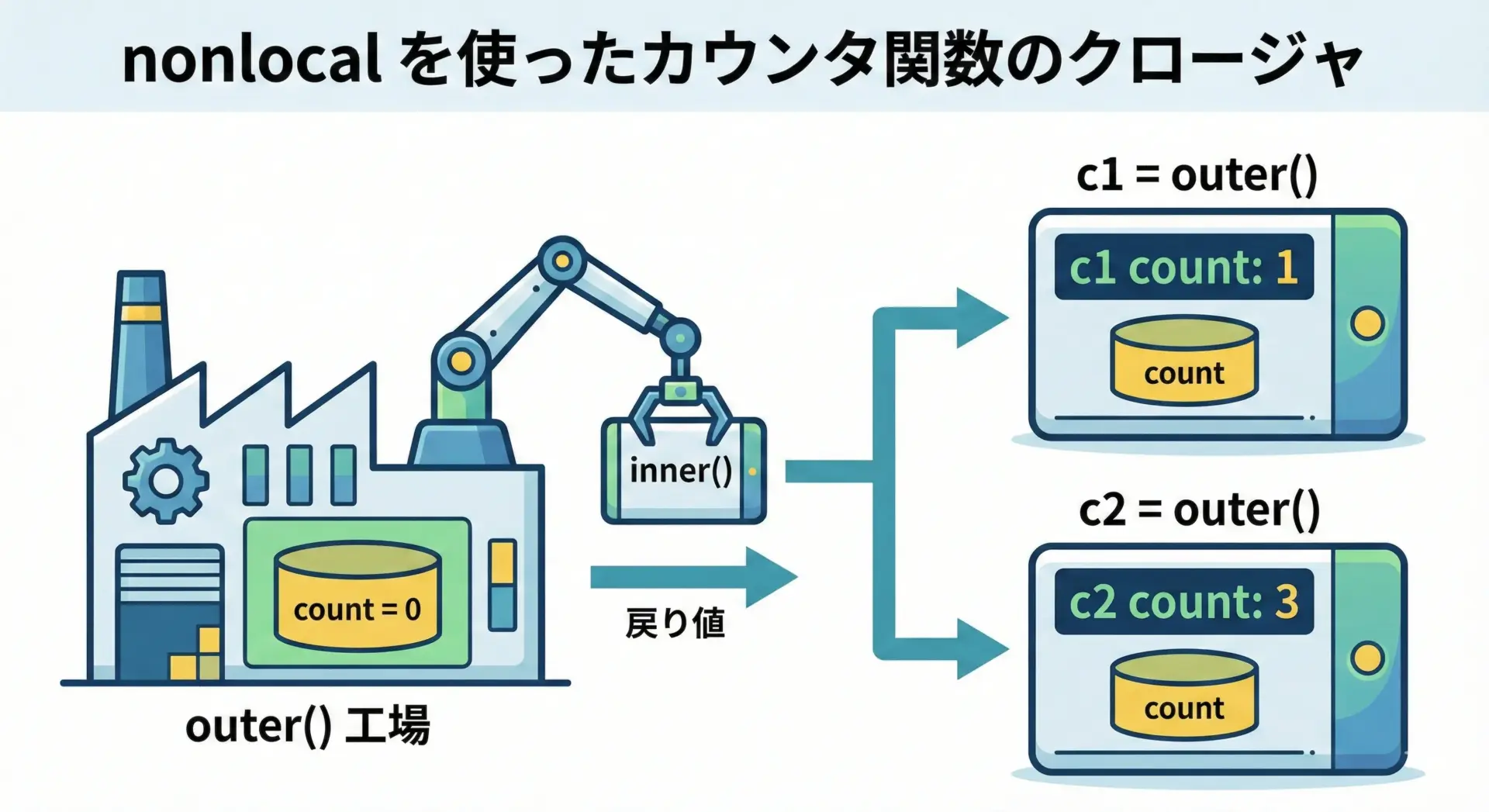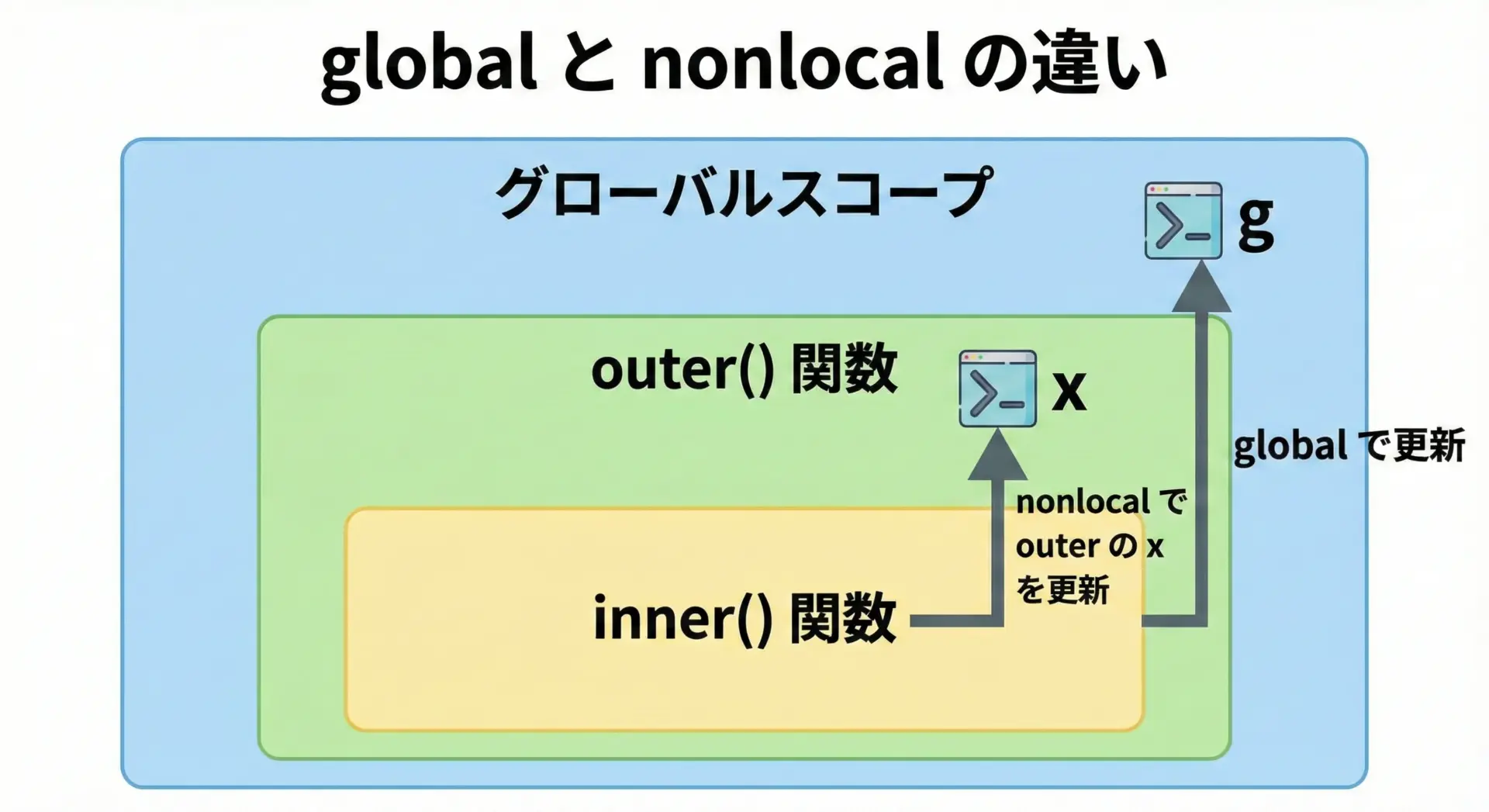 なお、nonlocalはあくまで「グローバルではない外側スコープの変数」を扱うためのものであり、グローバル変数を更新したい場合はglobalを使う必要があります。
