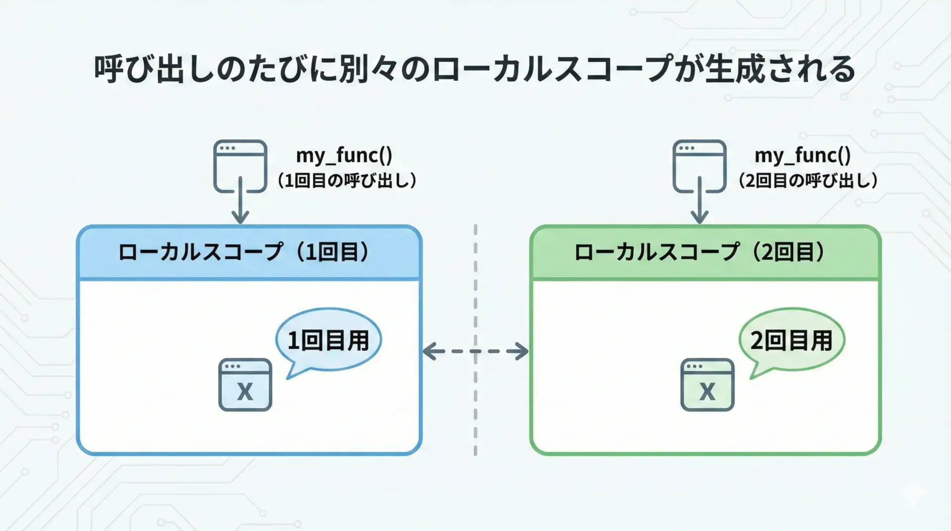 関数を呼び出すたびに、新しいローカルスコープが生成されます。