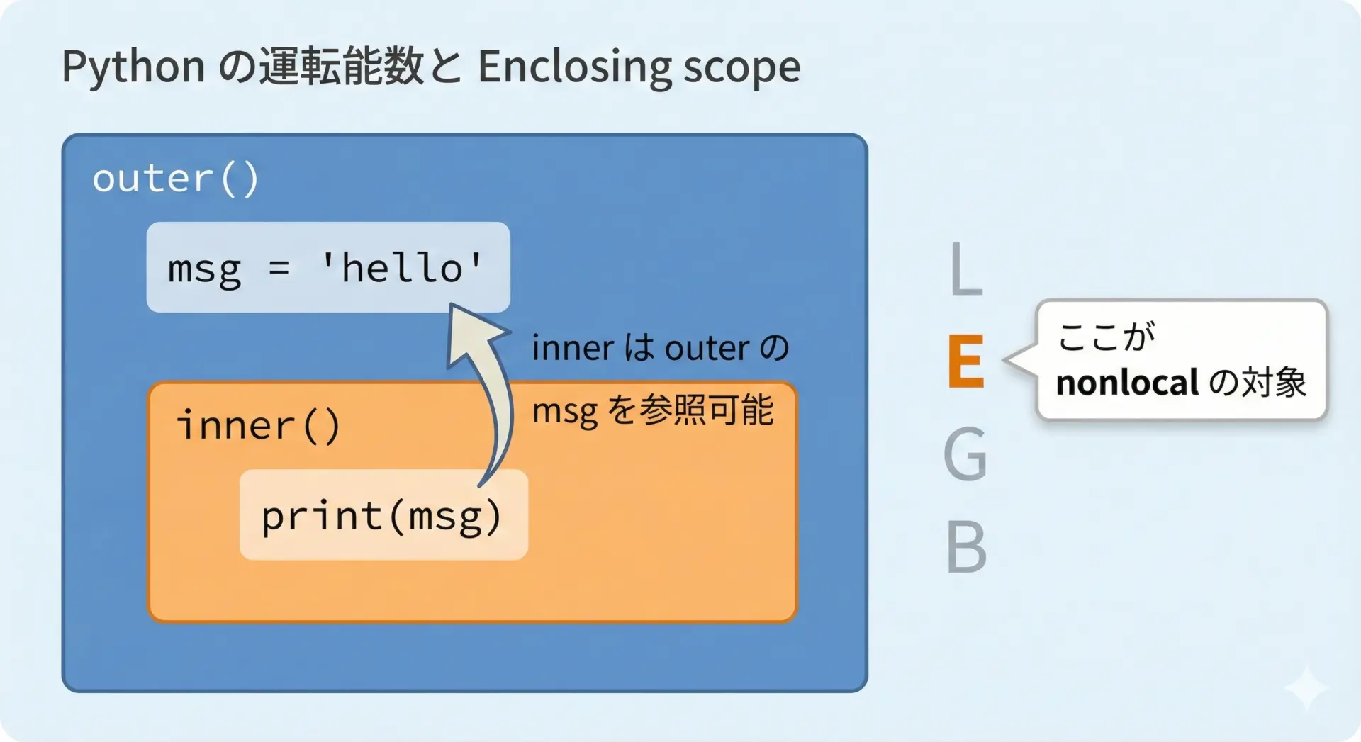 ネストした関数では、外側の関数のローカルスコープが「Enclosingスコープ」として内側から参照可能になります。