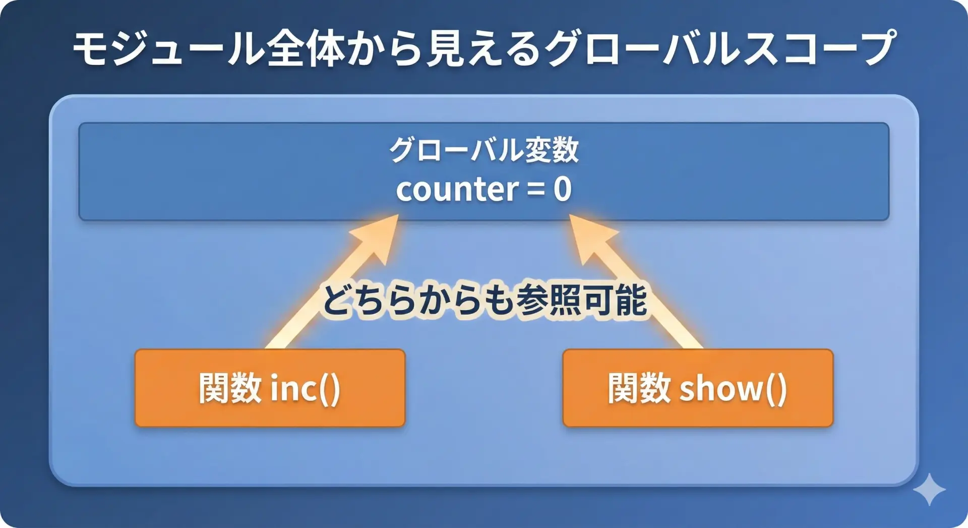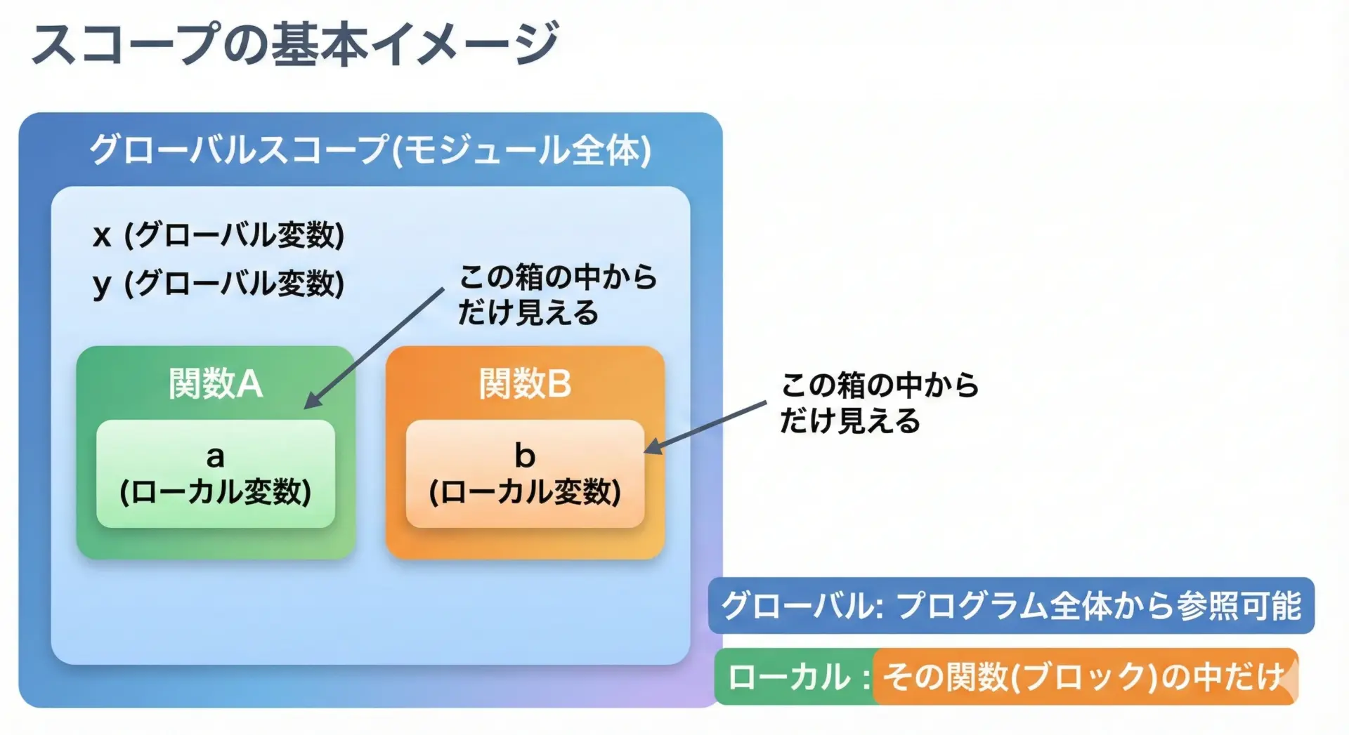 このルールを理解しておくと、同じ名前の変数が複数のスコープに存在するとき、どれが参照されるかを正しく予測できるようになります。