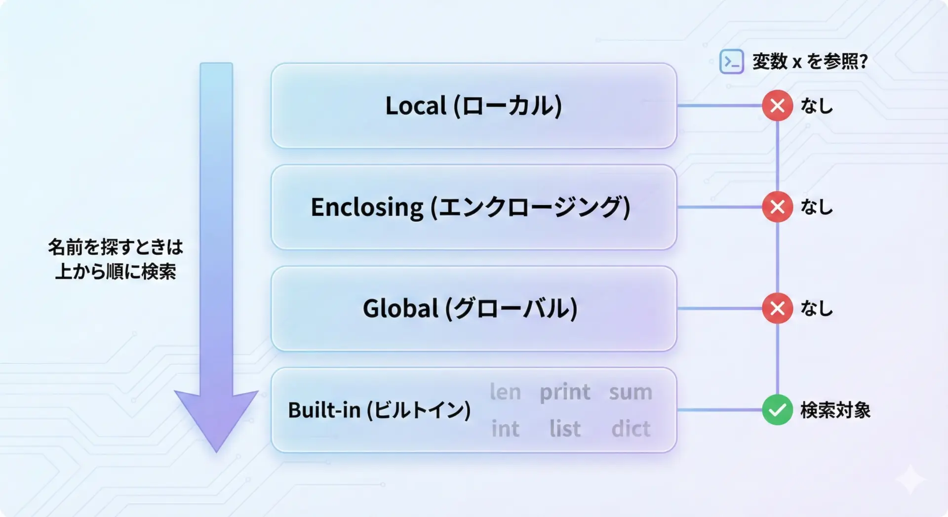 たとえば関数の中でxという変数名を参照した場合、まずその関数のローカル変数の中を探し、それでもなければ一段外側の関数、その次にグローバルスコープ、最後に組み込み(Built-in)の名前空間を探します。