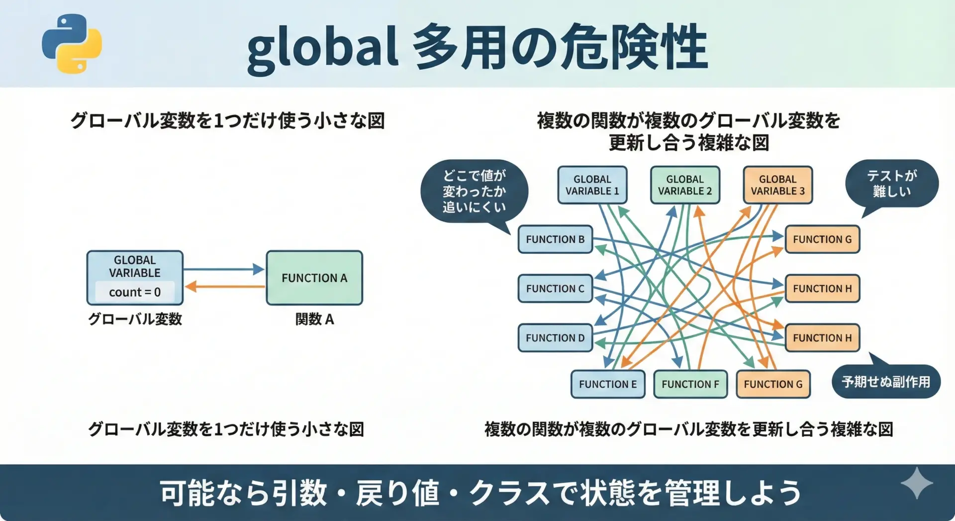 どうしてもglobalを使う必要がある場合は、globalキーワードを使っている箇所をできるだけ限定し、「この関数はグローバル状態を変更する特別な処理である」ということが分かるように設計するとよいでしょう。