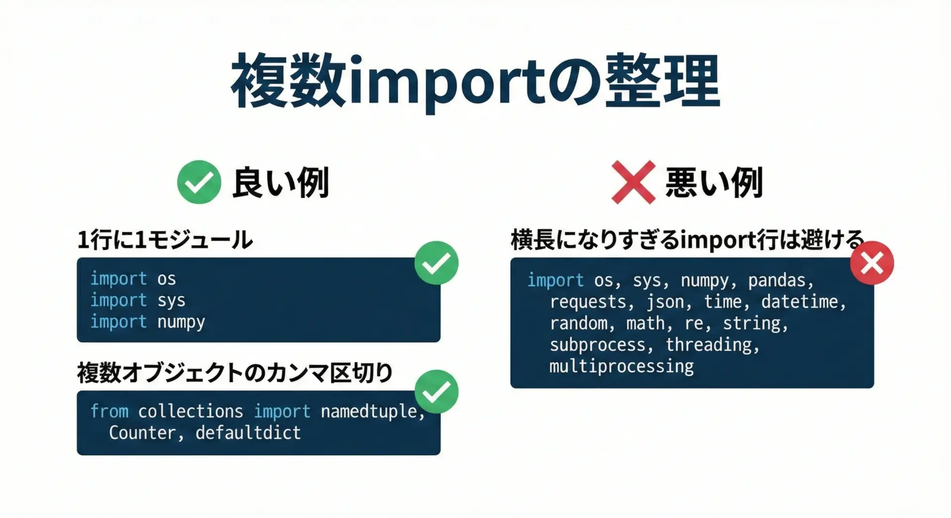 Pythonでは、可読性の観点から1行に1つのモジュールを書くのが推奨されています。