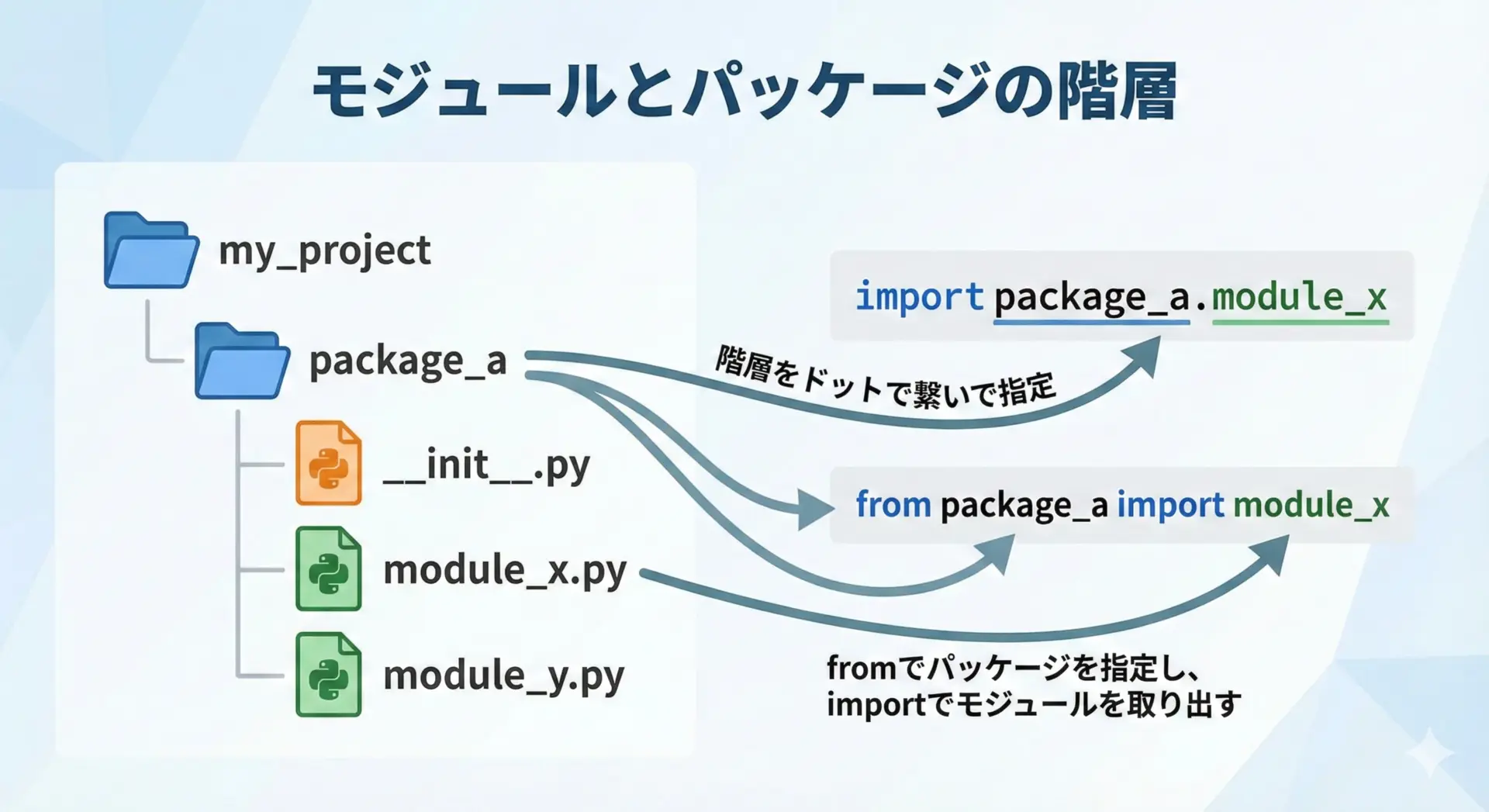 Pythonのimportは、モジュールとパッケージという2つの概念と密接に関係しています。