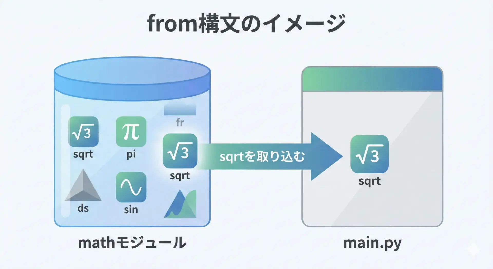 このように、モジュール全体を読み込んでmath.sqrtのように使うか、特定の関数だけを直接使うかによって書き方が変わります。