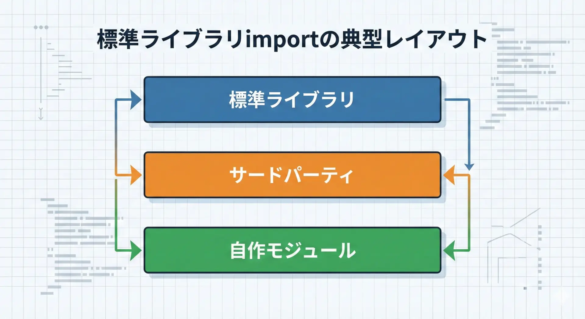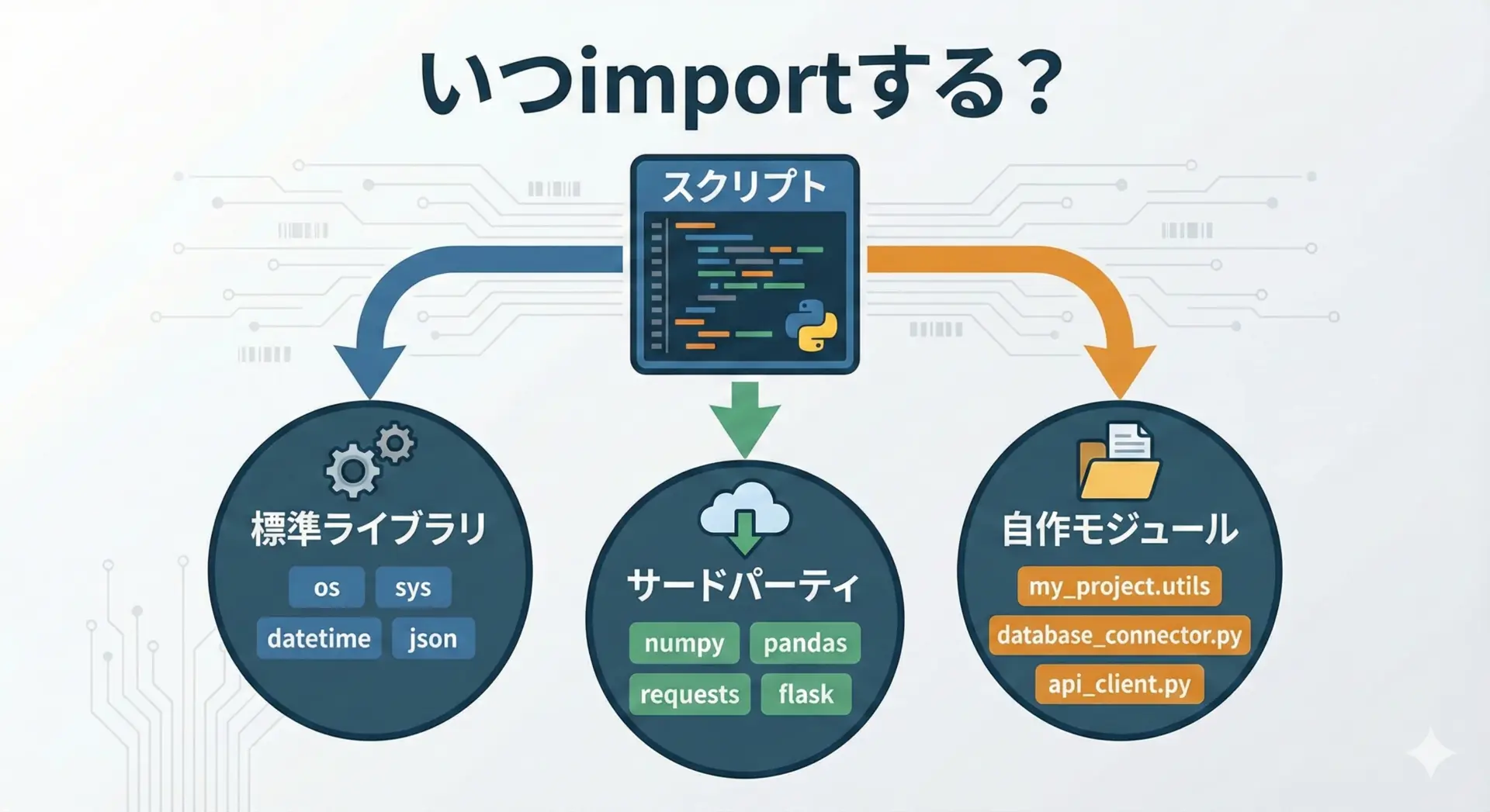標準ライブラリやサードパーティ、さらに自作モジュールを正しく読み込めると、コードの再利用性や保守性が大きく向上します。