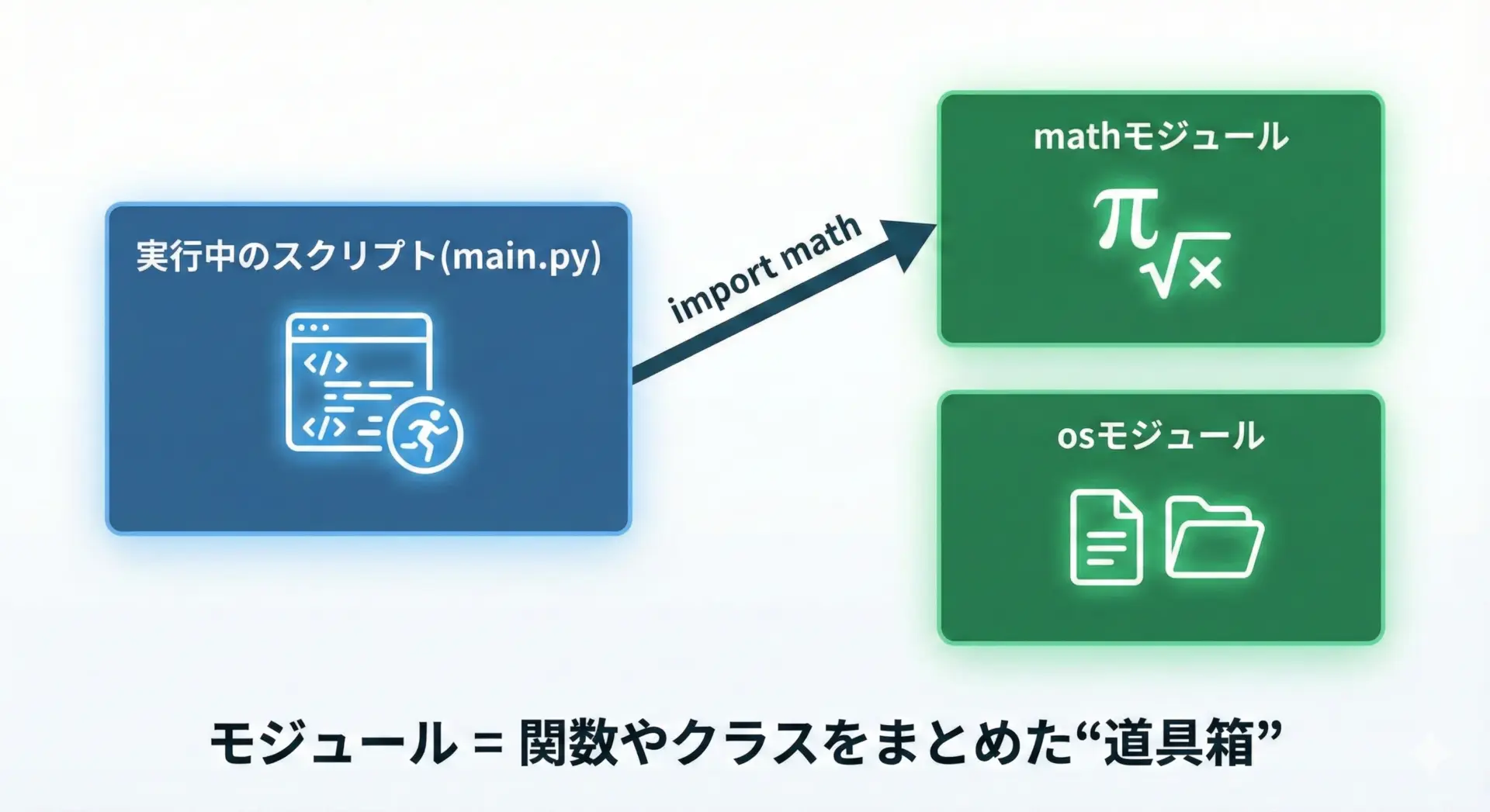 | モジュール | 1つの.pyファイル | math.py(組み込み)、utils.py(自作) | import math |