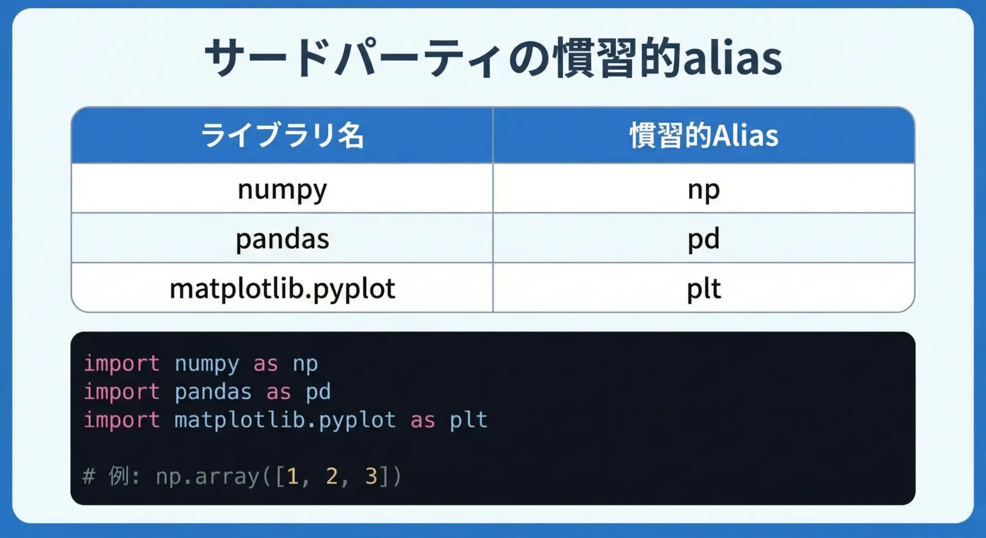 Python界隈では、よく使われるライブラリに慣習的な別名があります。
