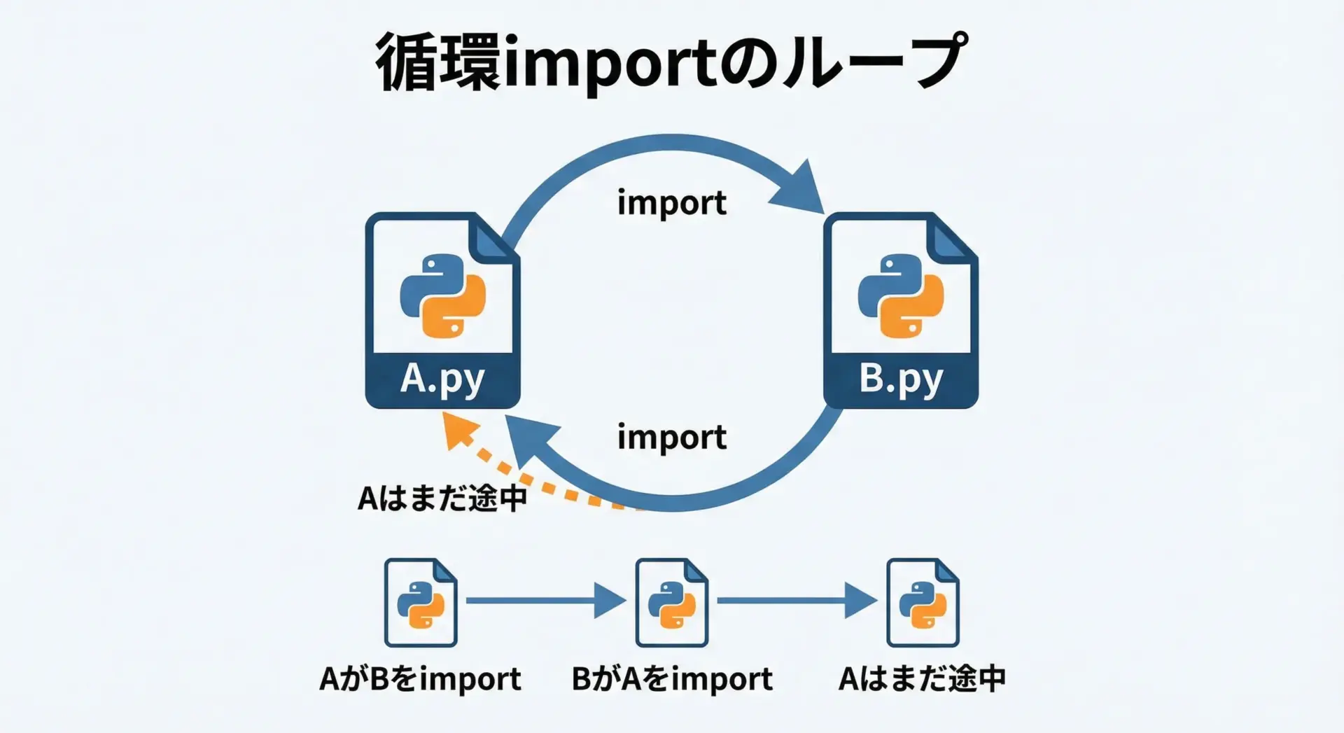循環importは、2つ以上のモジュールが互いに相手をimportし合うことで、初期化が最後まで完了しない状態になる現象です。