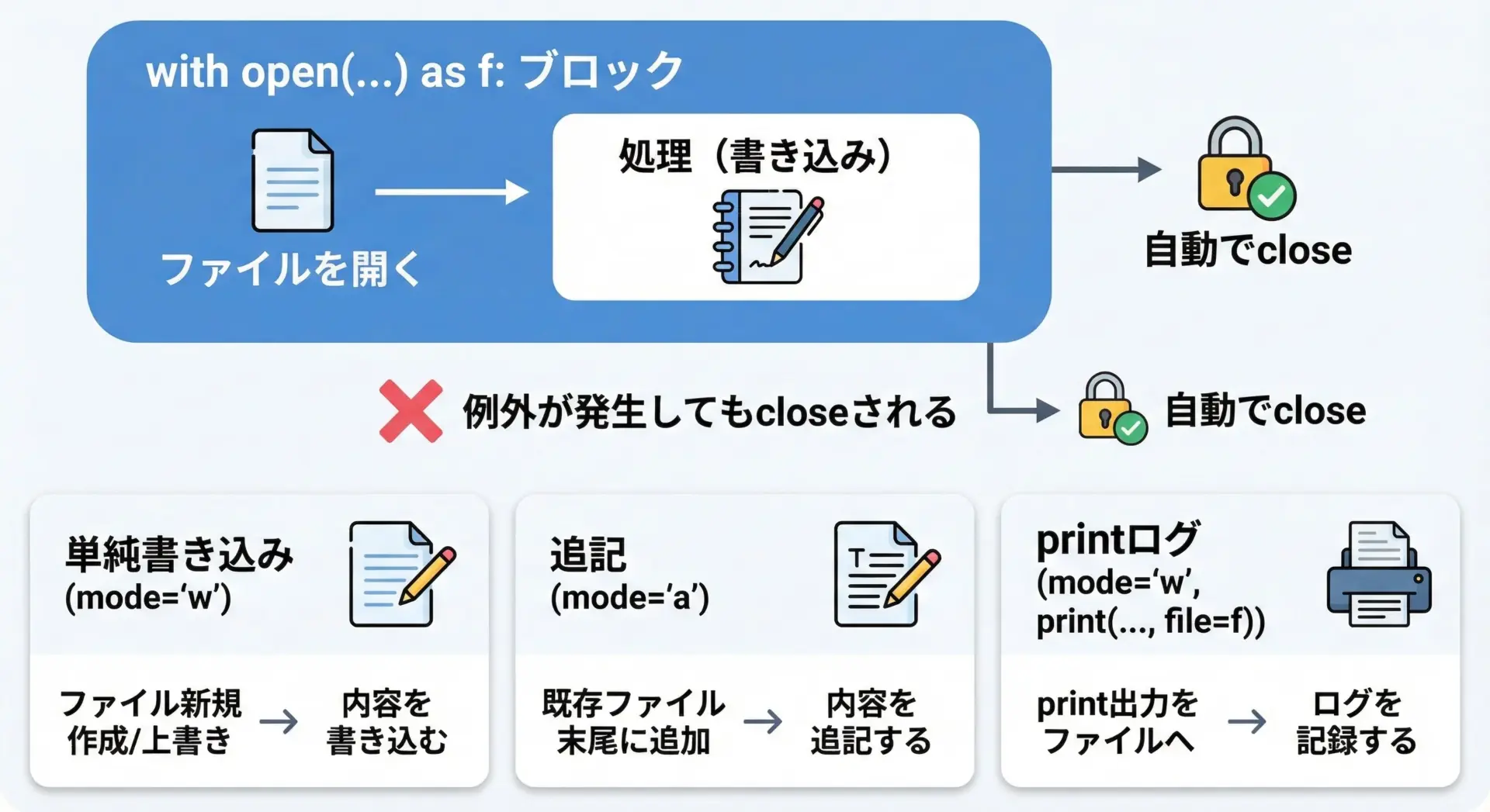 本記事ではopenのモード(w/a/x)とencoding、writeとprintの使い分け、そして実務で使えるログ出力・設定ファイル・レポート生成のパターンを、サンプルコードとともに解説しました。