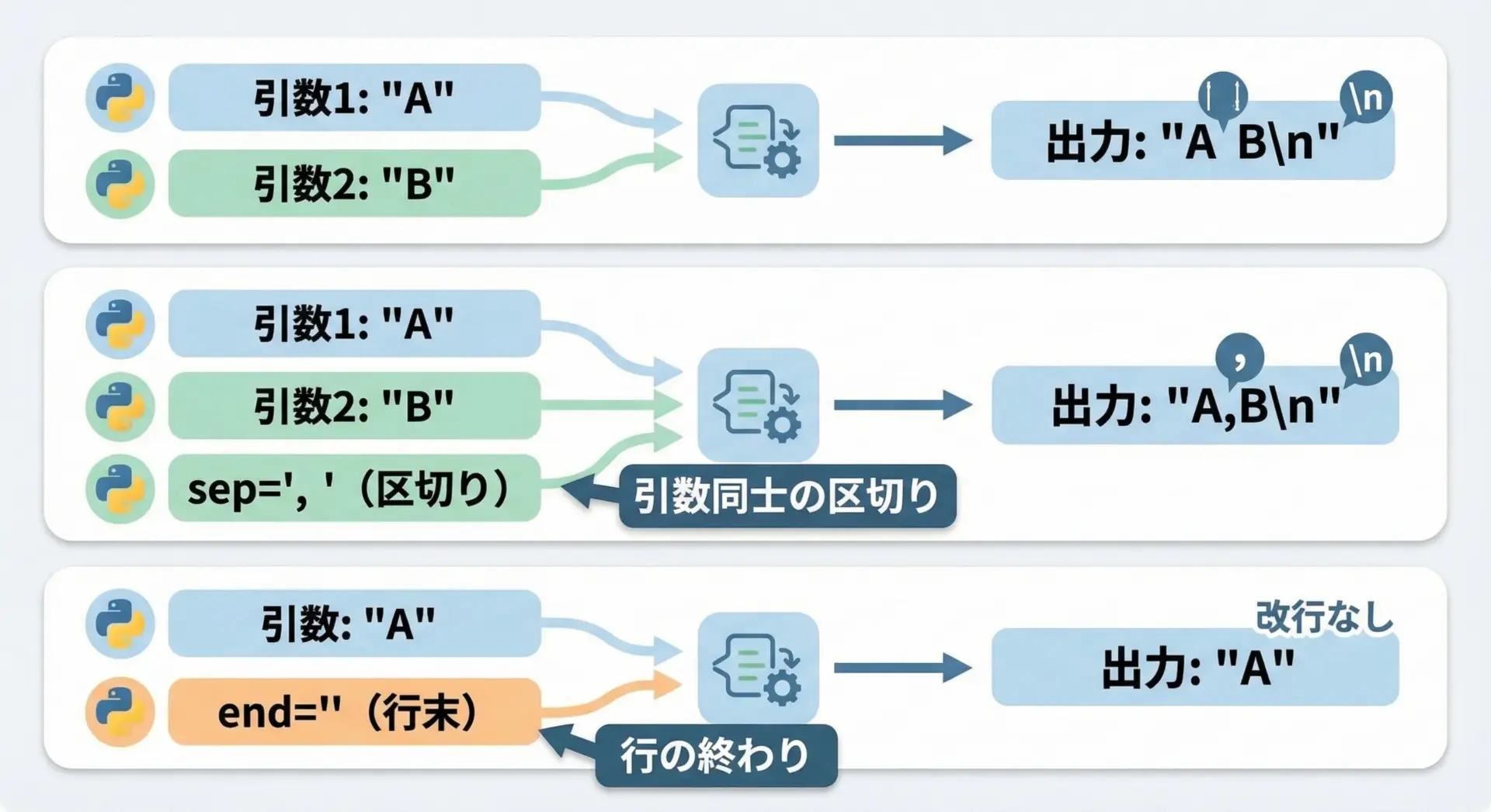 改行を入れながら複数の行を書きたい場合は、文字列中に"\n"を挟みます。