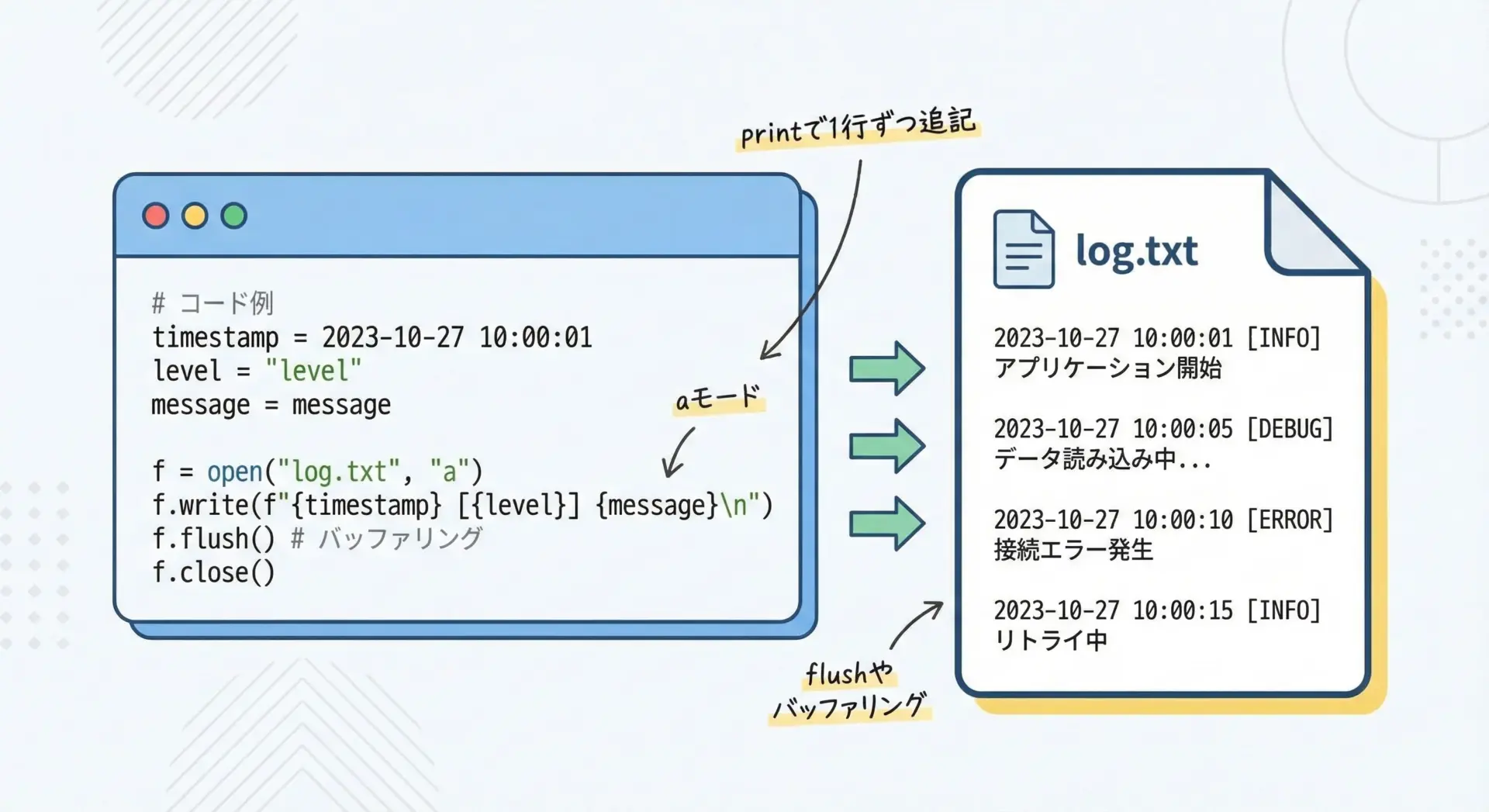 Pythonでテキストファイルを書き込むことは、ログを保存したり、レポートを自動生成したり、ちょっとしたメモを残すときにも役立つ、とても実用的なスキルです。