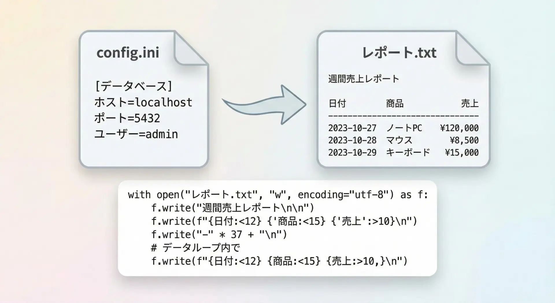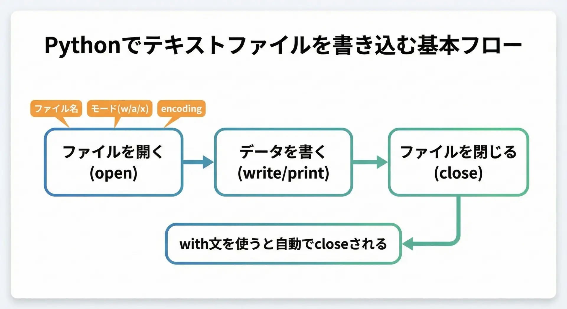 改行や文字コードの扱い、with文による安全なクローズを意識すれば、ファイル入出力のトラブルは大幅に減らせます。