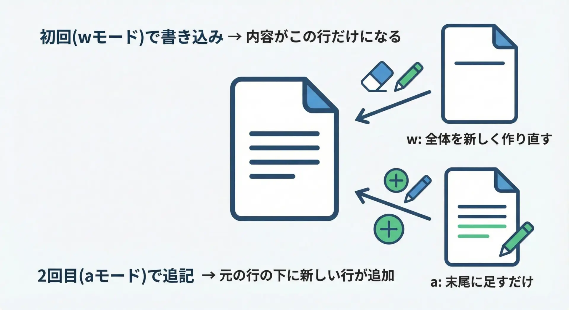 | a | 追記(append) | 末尾に追記する | 新規作成して書き込む |