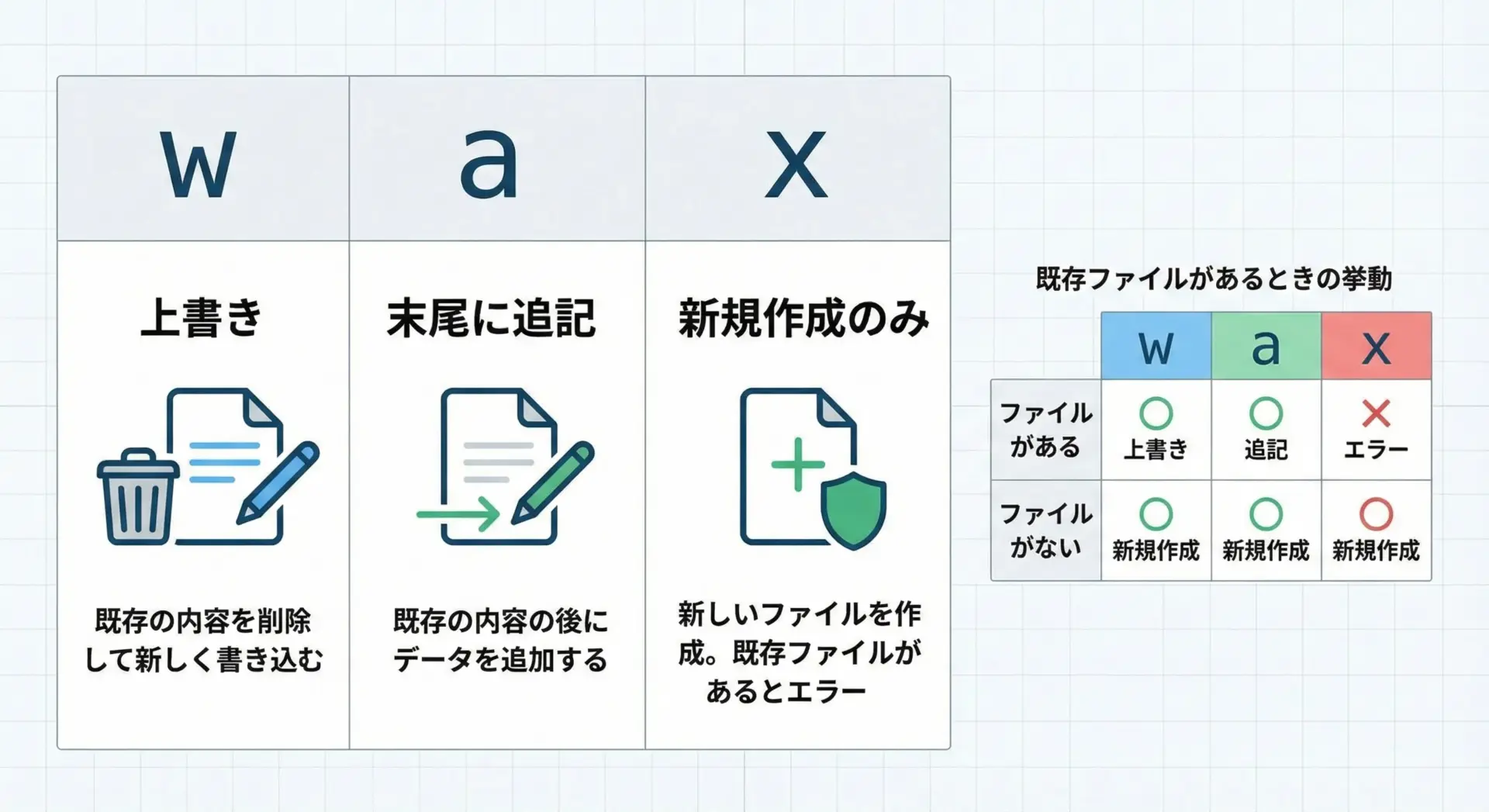 | モード | 意味 | 既存ファイルがある場合 | ない場合 |