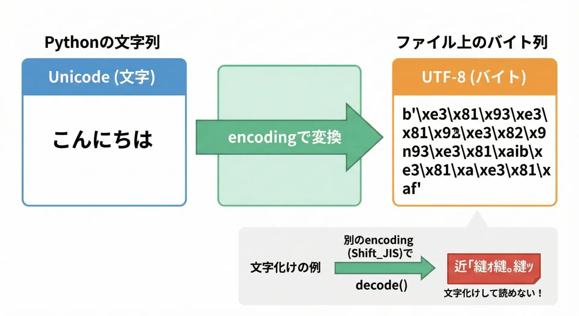 異なるencodingでファイルを開くと文字化けが発生するため、どのencodingで保存したかは、プロジェクト全体で統一しておくことがとても重要です。
