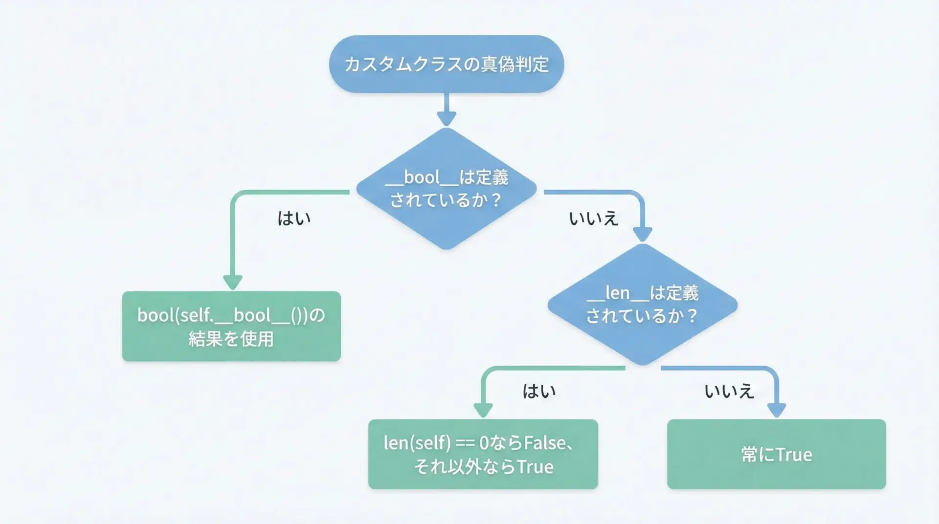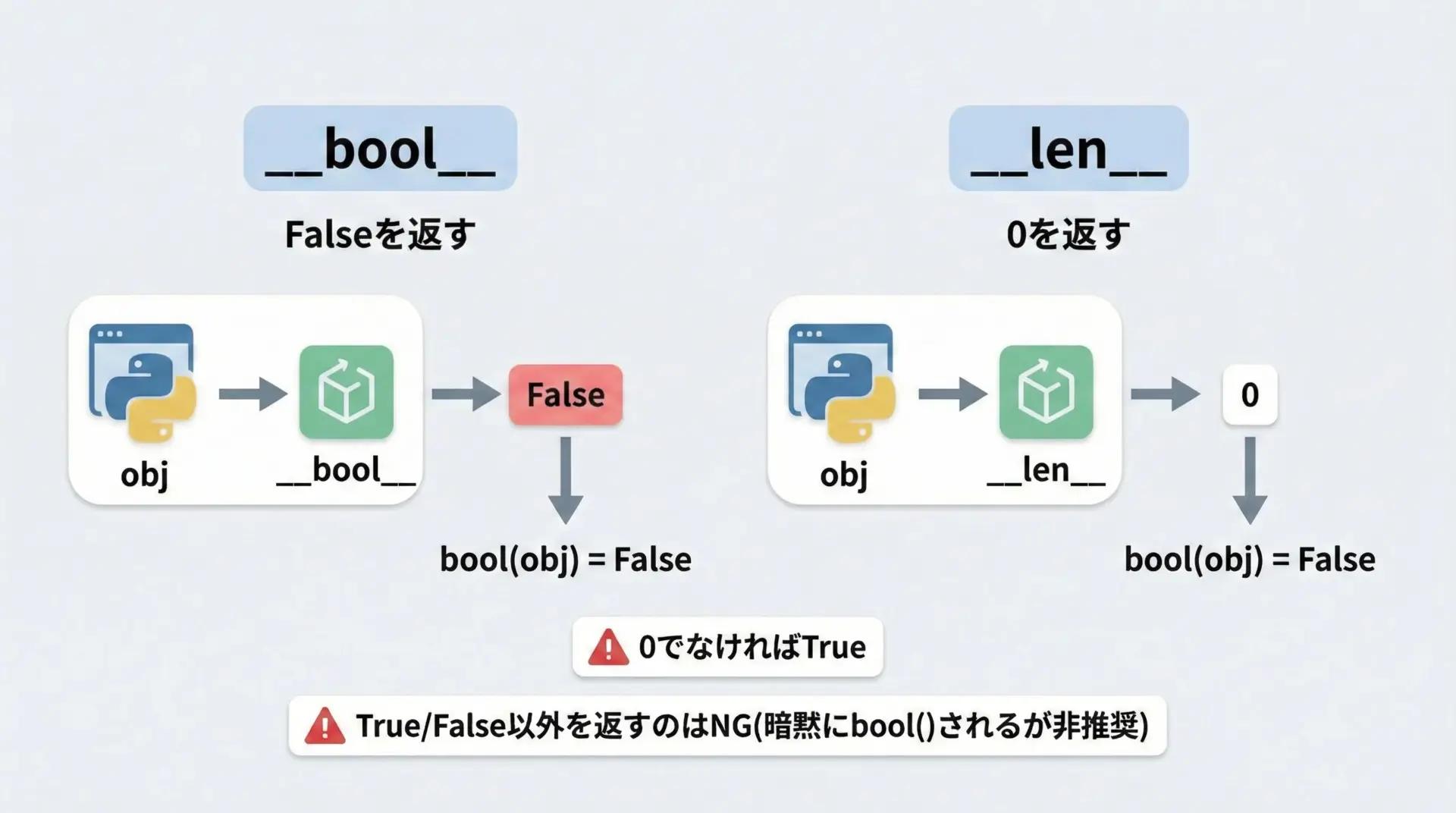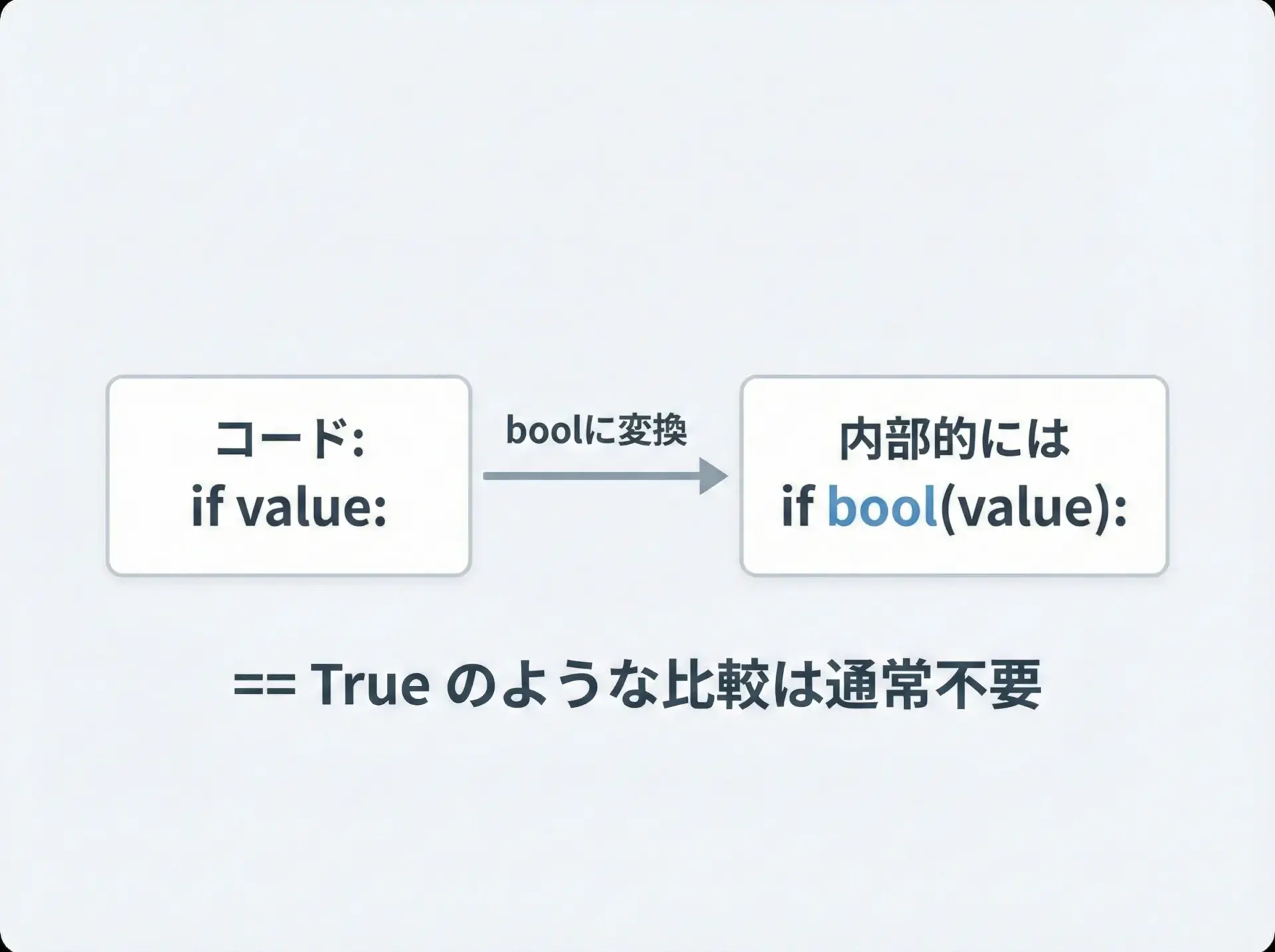 この仕組みを理解しておくと、わざわざ== True!= 0のような冗長な書き方を避け、よりPythonicなコードを書けるようになります