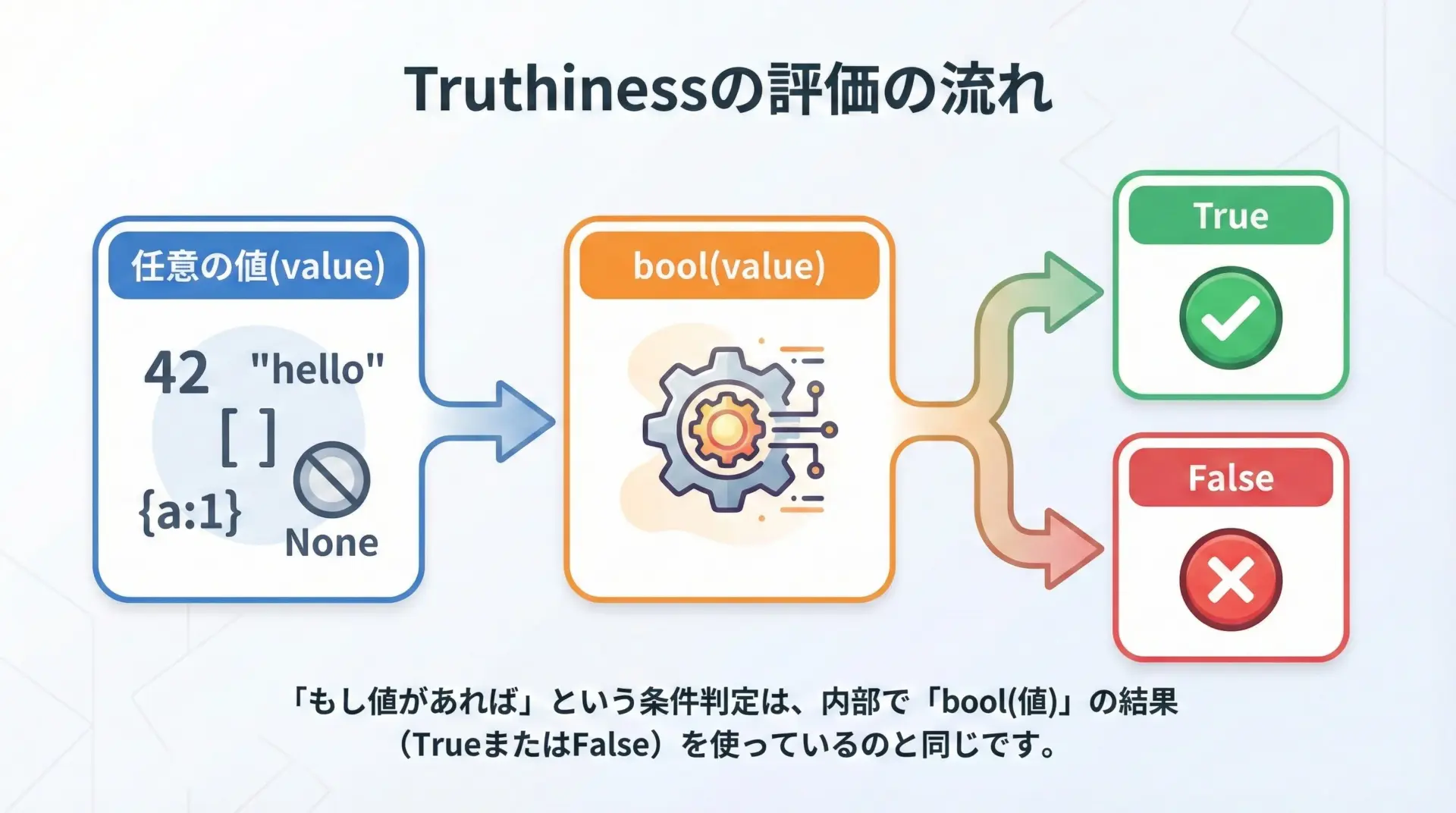 これらはいずれも「値 → boolに変換 → True/Falseで判定」という流れで動いています。