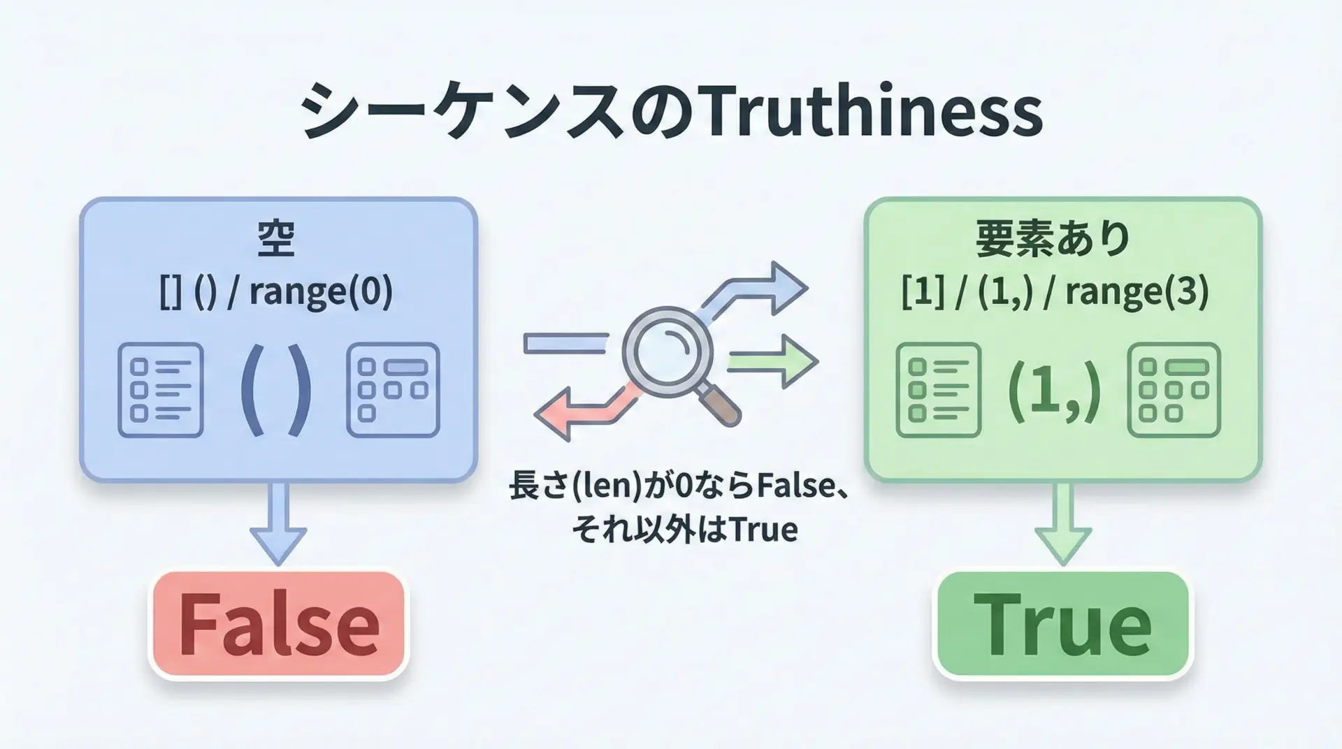 PythonのTruthinessは「False扱いになる少数の特別な値」と「それ以外はすべてTrue」というシンプルなルールで構成されています。
