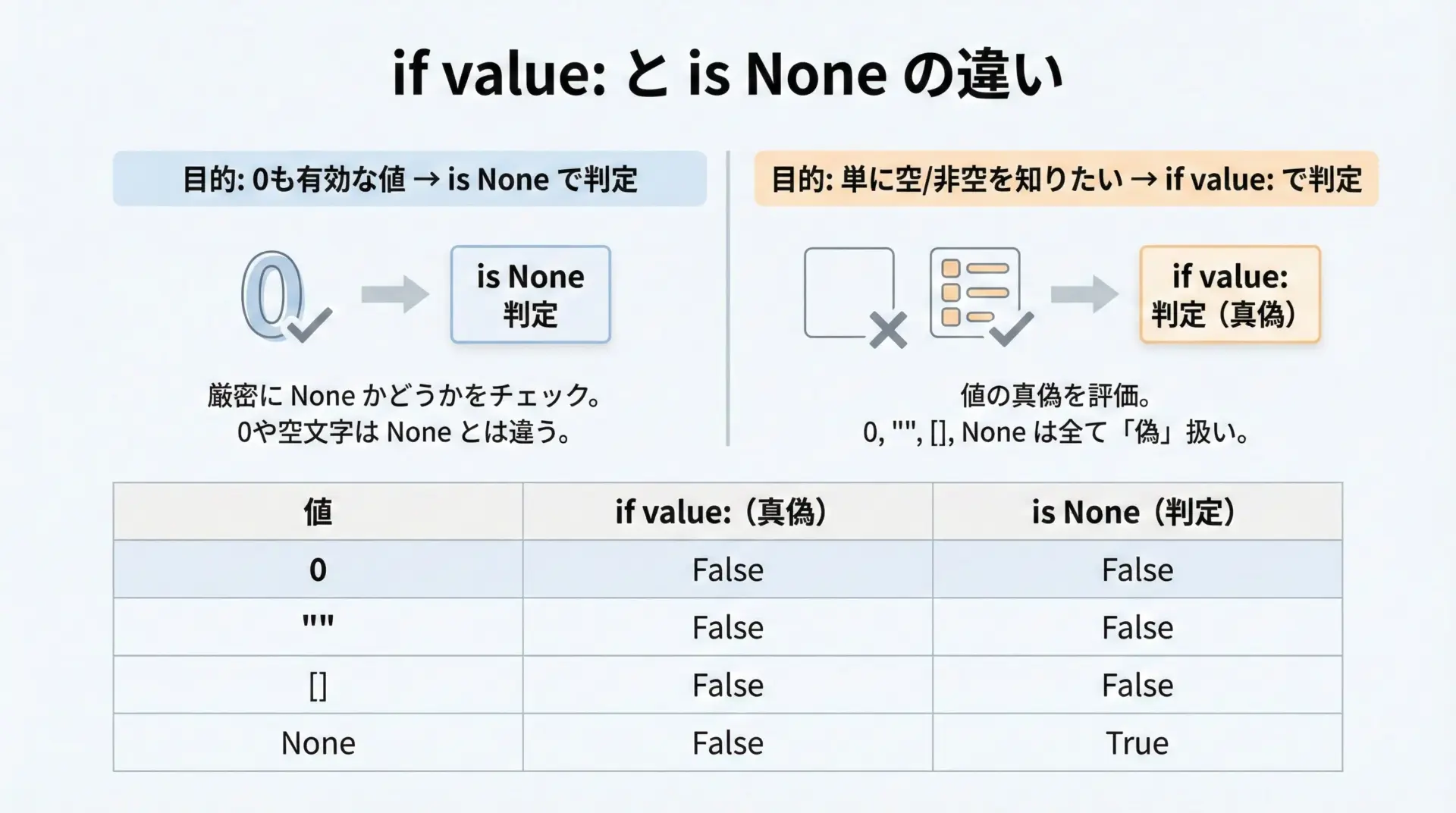 一方で、Noneを判定したいときはis Noneを使う、0も有効な値ならTruthinessに頼りすぎないなど、使い分けも重要です。